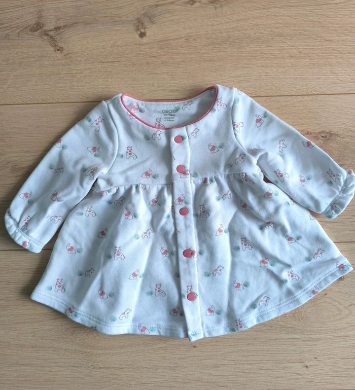 Ensemble Obaïbi qui comprend : - 1 Robe manches longues un peu chaude blanche et rose avec motifs éléphants et girafes 85% coton et 15% polyester - 1 pantalon côtelé rose pâle 95 % coton et 5% elasthanne -1 t-shirt manches longues blanc motifs hérissons qui se ferme à l'arrière avec des boutons pressions Vêtements achetés neuf à la naissance de ma fille et portés une seule fois sauf le t-shirt qui n'a jamais été porté juste lavé Taille 1 mois - 53cm #titine3186_fille_naissance_1mois