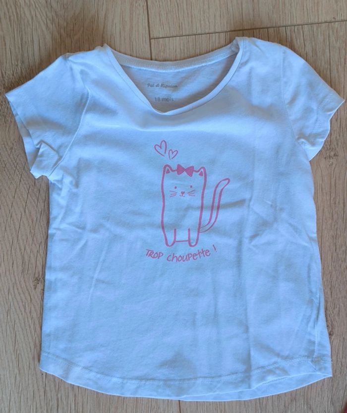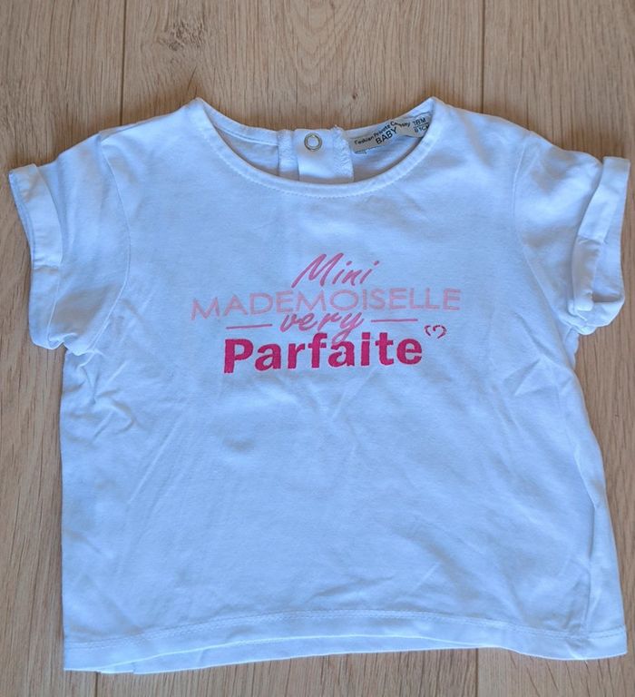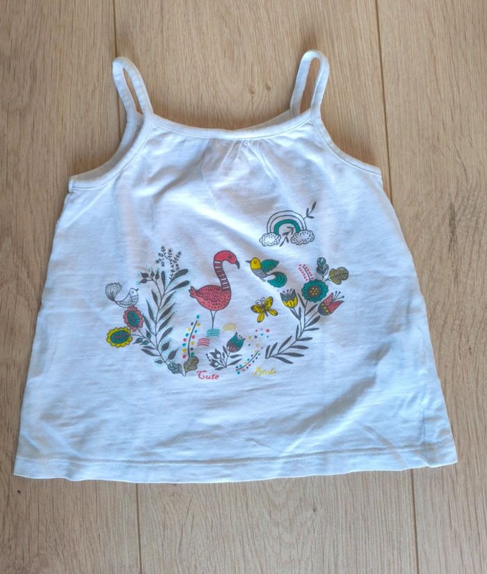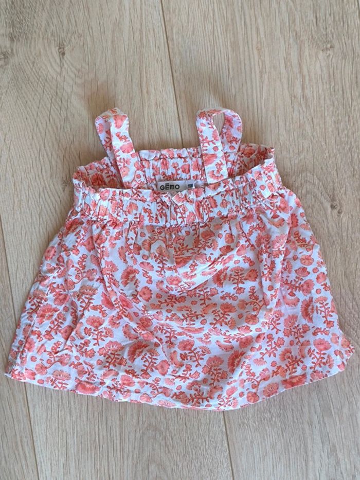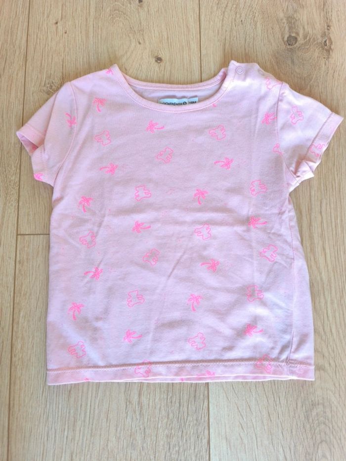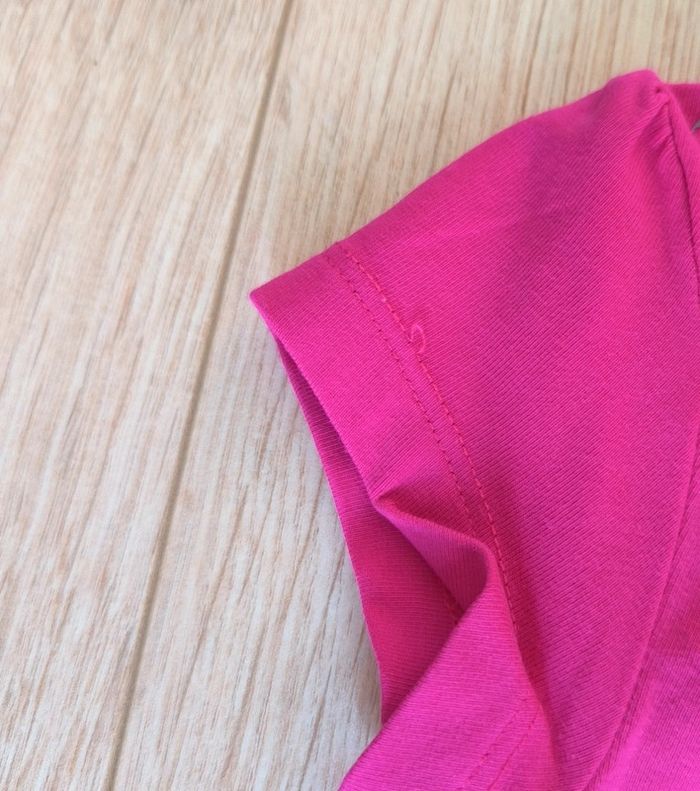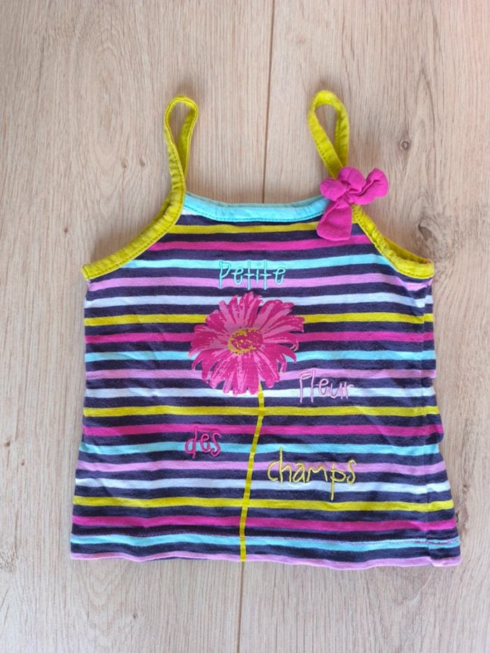 Les 3 débardeurs sont en très bon état. Tous les t-shirts sont en très bon état. A noter un petit défaut de couture sur la manche du t-shirt Orchestra rose visible en photo, 2 légères tâches sur le t-shirt fleur Obaïbi (visible en photo), quelques bouloches sur le t-shirt rose fluo Kiabi.