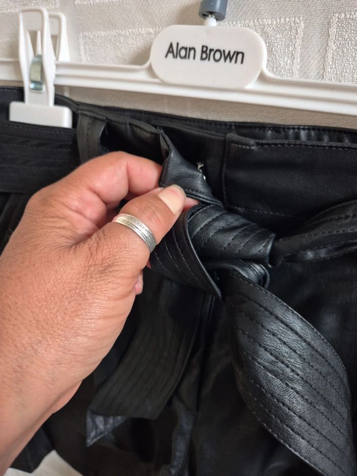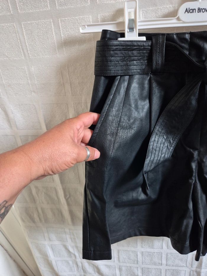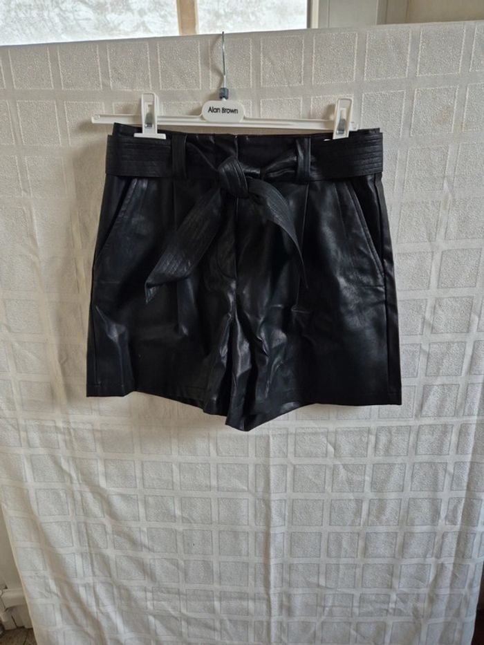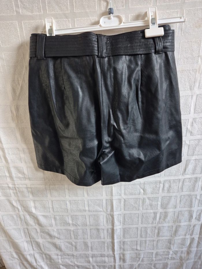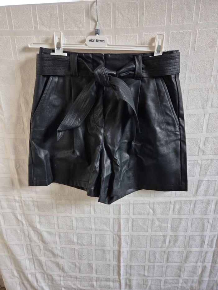 un short en simili cuir avec ceinture à nouer et poches latérales, il mesure 41 cm de longueur.