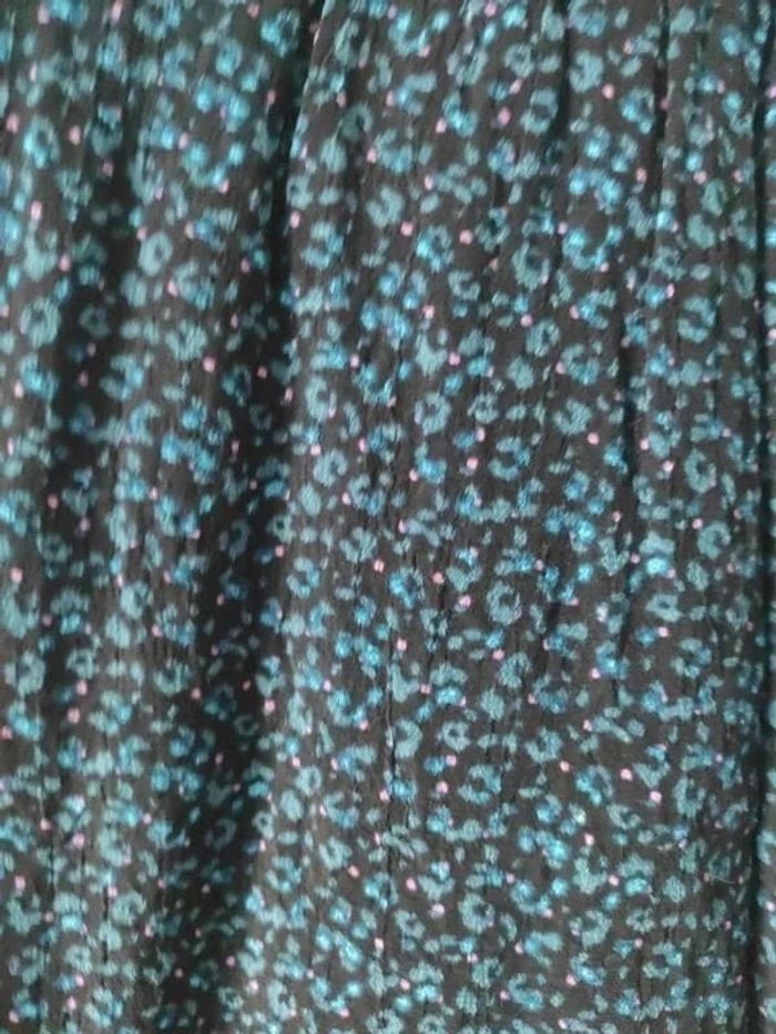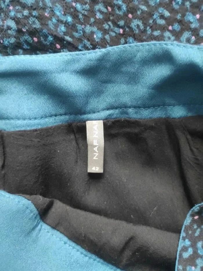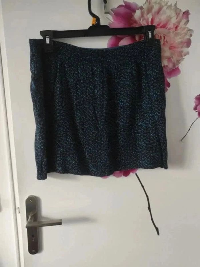 En crêpe entièrement doublée Motif fleurs bleues sur fond noir 44 cm à plat à la taille 42 cm de hauteur Très peu portée état neuf