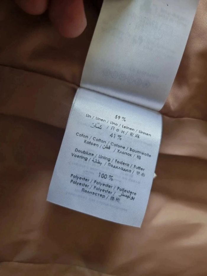 Veste ouverte 59% lin et 41% coton Entièrement doublée par doublure 100 %polyester Couleur beige / jaune 46 cm d'aisselle à aisselle 69 cm de longueur totale à partir du haut de l'épaule Neuve avec étiquette