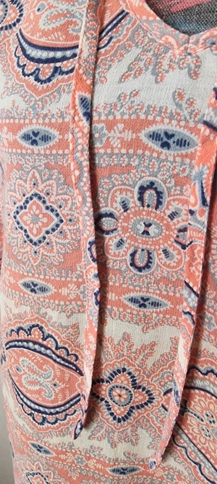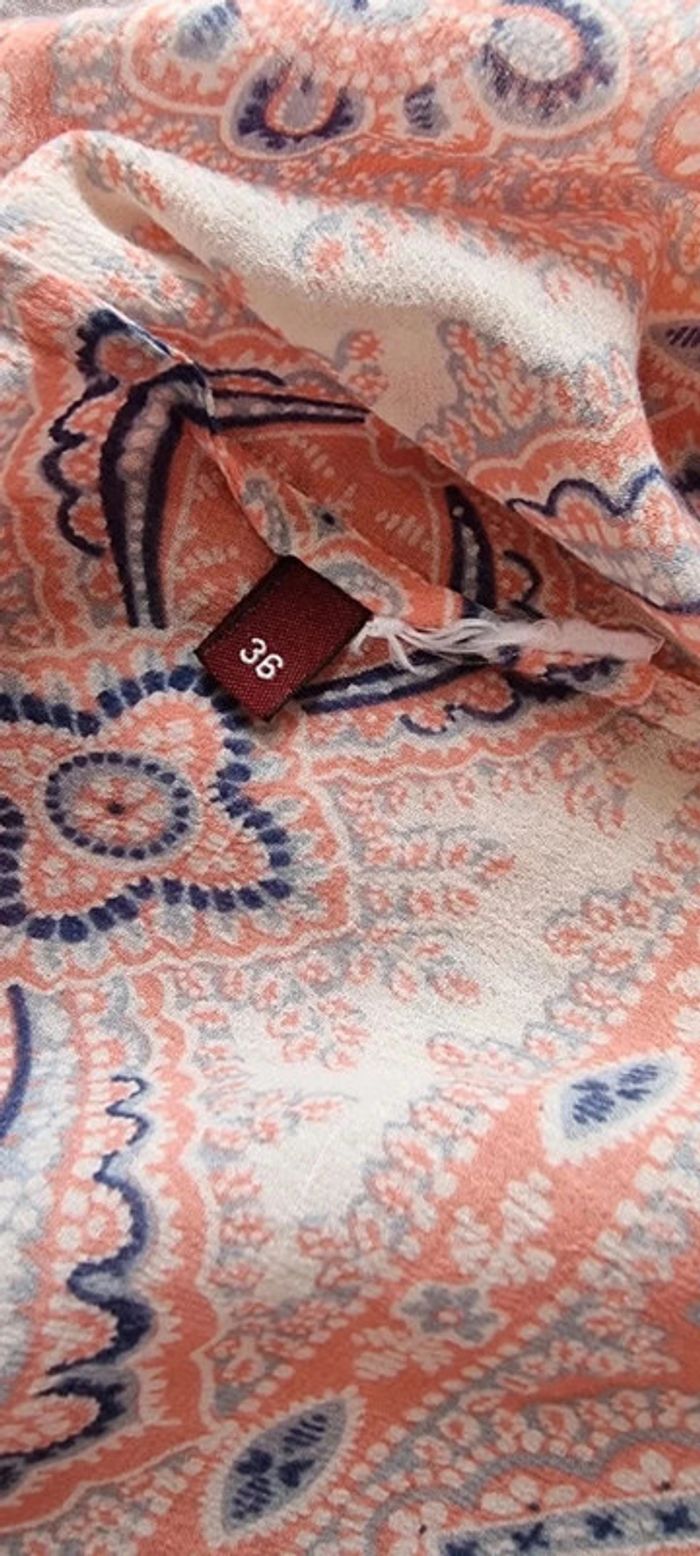 1 poche poitrine Manches 3/4 50 cm d'aisselle à aisselle 75 cm de hauteur 100 % soie Motif arabesques Lien à nouer devant Étiquette coupée Très agréable à porter État neuf