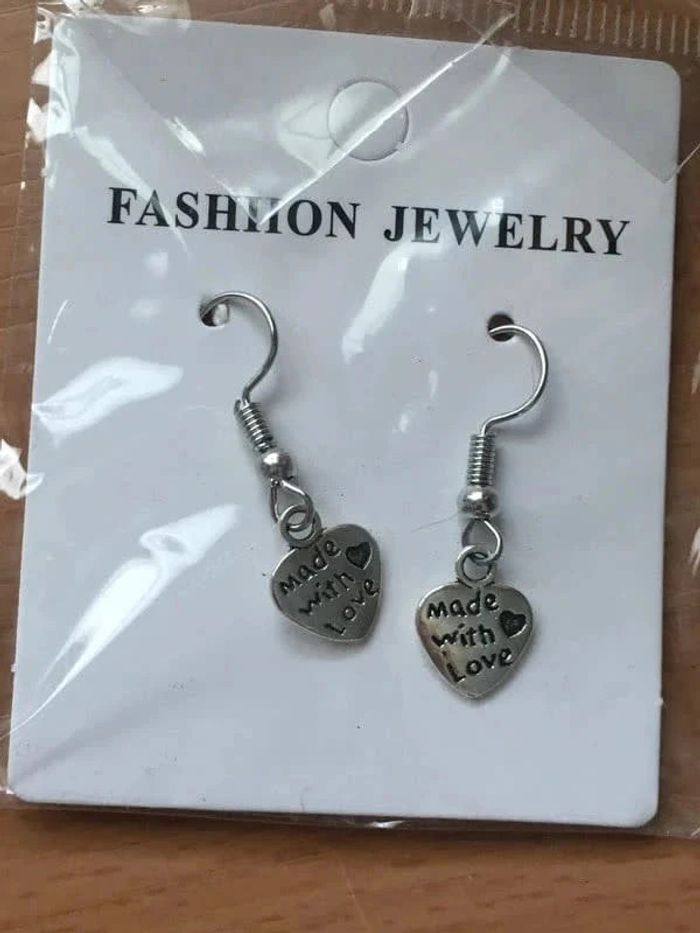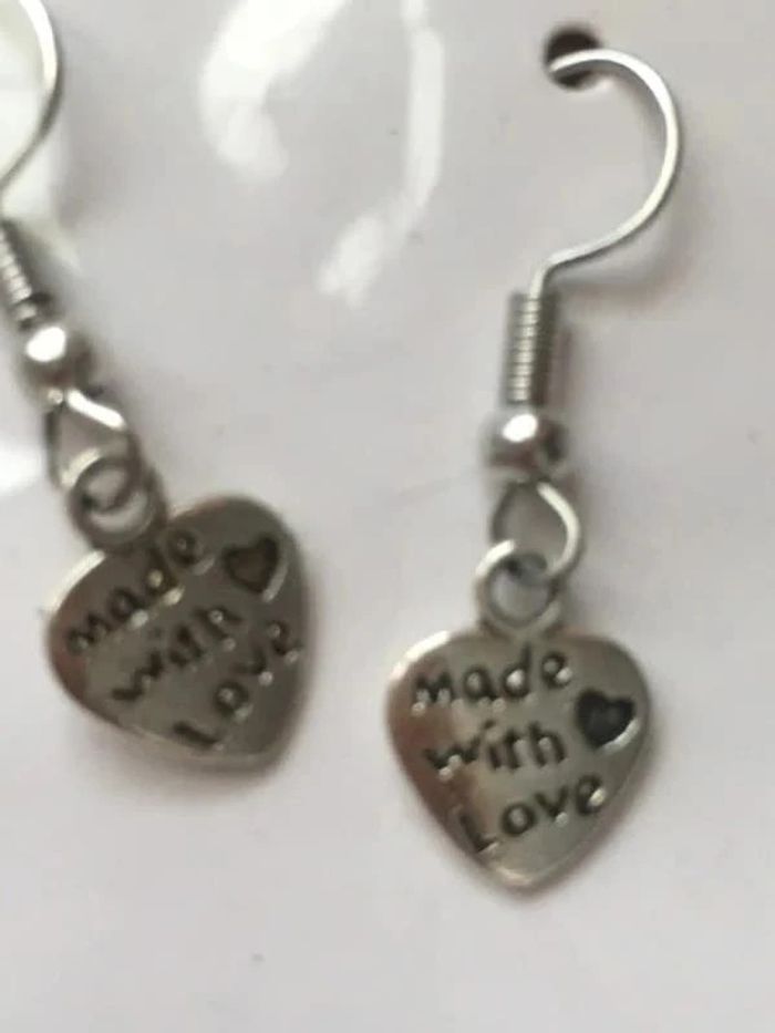 boucles d’oreilles avec cœur en métal argenté inscription « made with love » neuf emballé