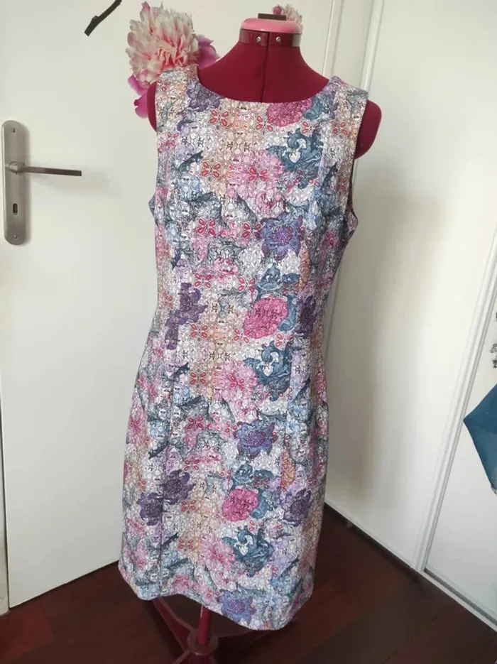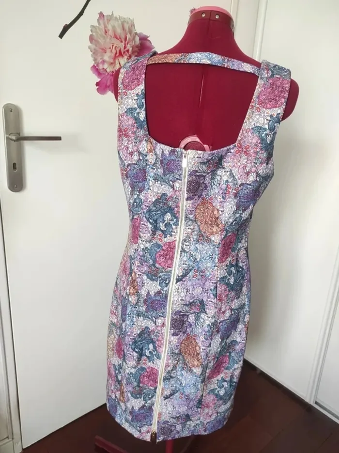 En tissu fleuri légèrement épais qui donne un effet amincissant Longueur 94 cm 47 cm sous les aisselles Longue fermeture au dos Très peu portée état neuf