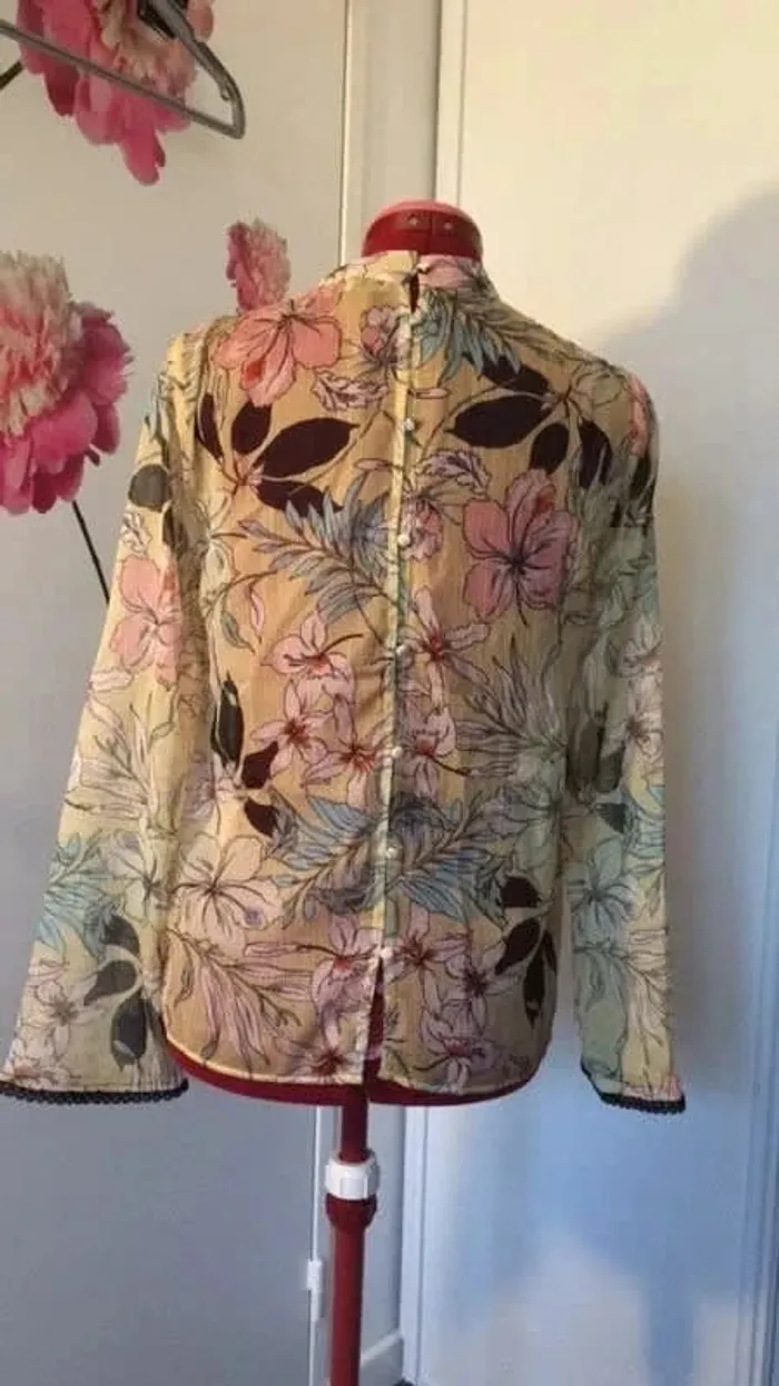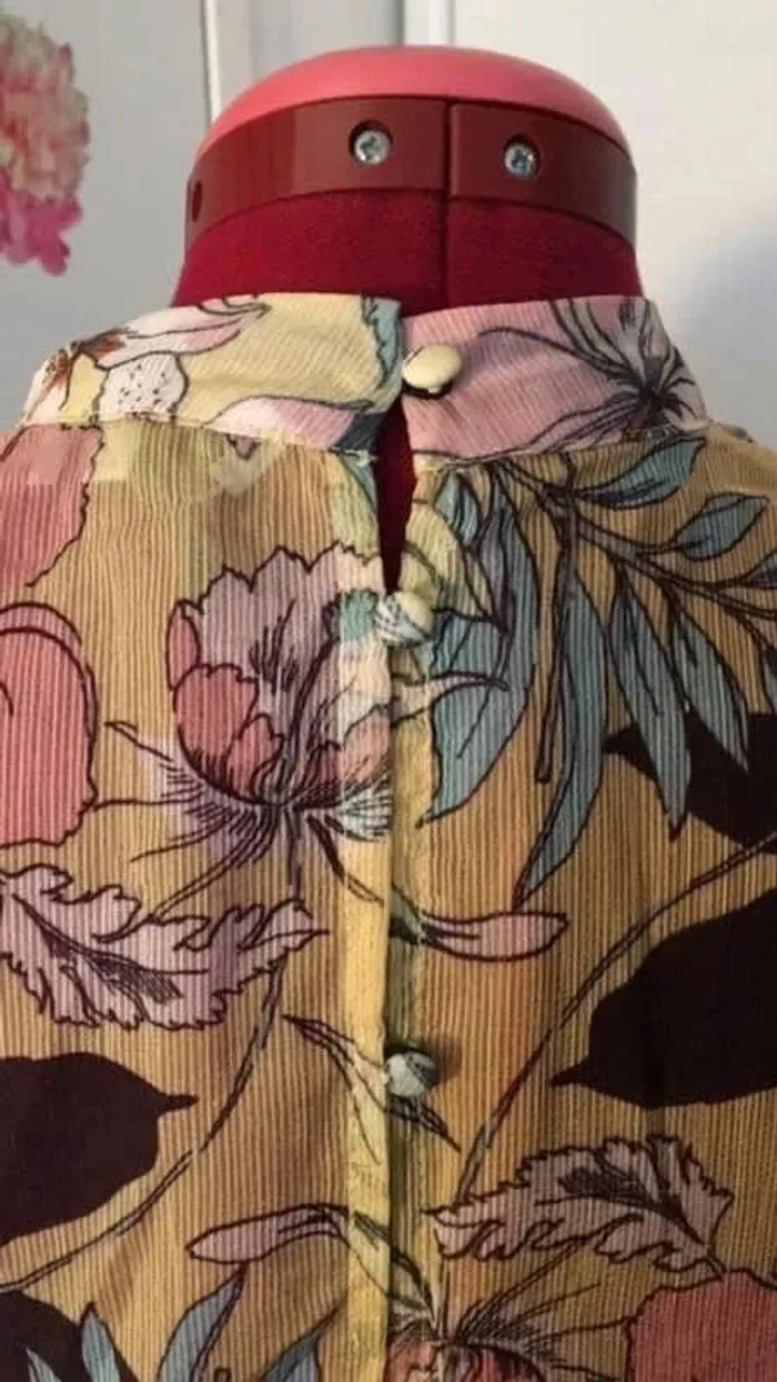 boutons au dos bande de fine dentelle en haut et au bas des manches longues motif fleurs et feuilles sur fond jaune couleur des motifs rose, bleu, vert et noir neuf avec étiquette et bouton de rechange