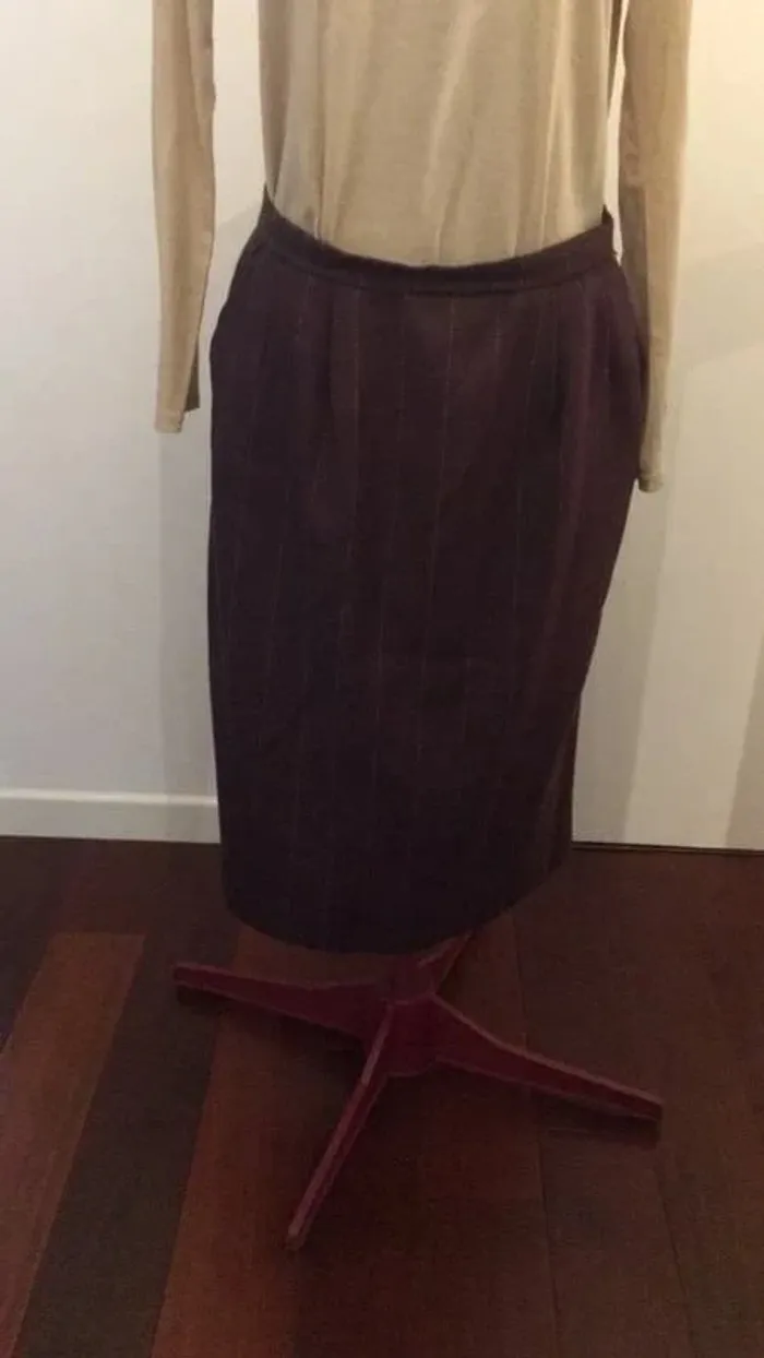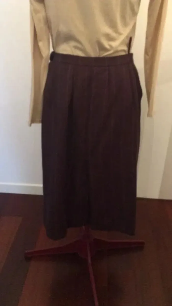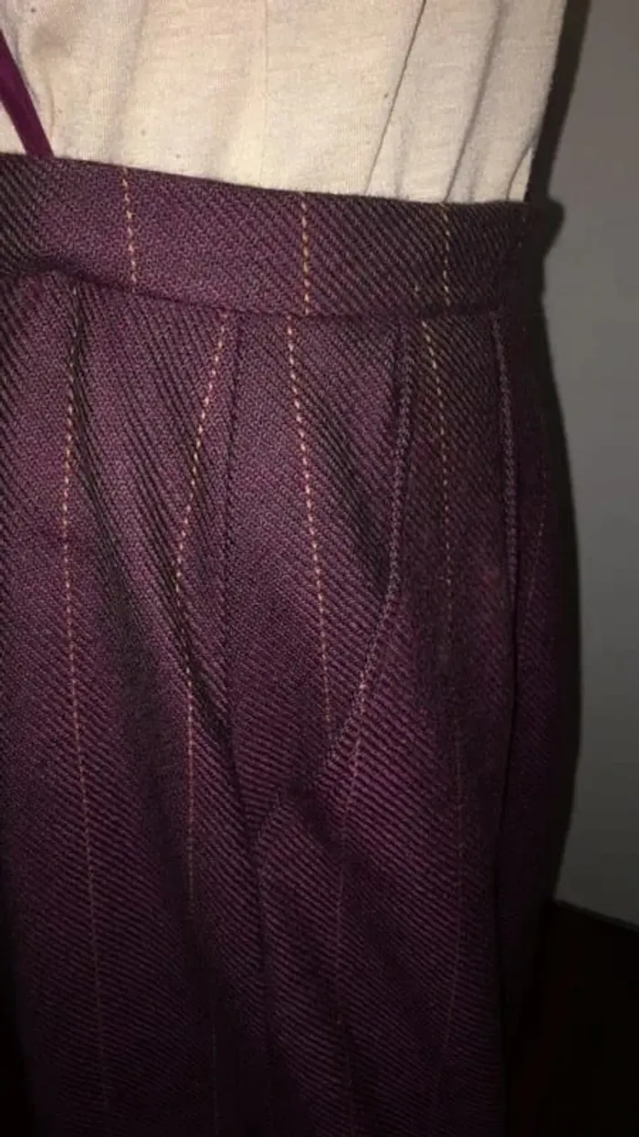 couleur lie de vin et fines rayures moutarde entièrement doublée longueur 68 cm très bon état fente à l’arrière et 2 poches côtés