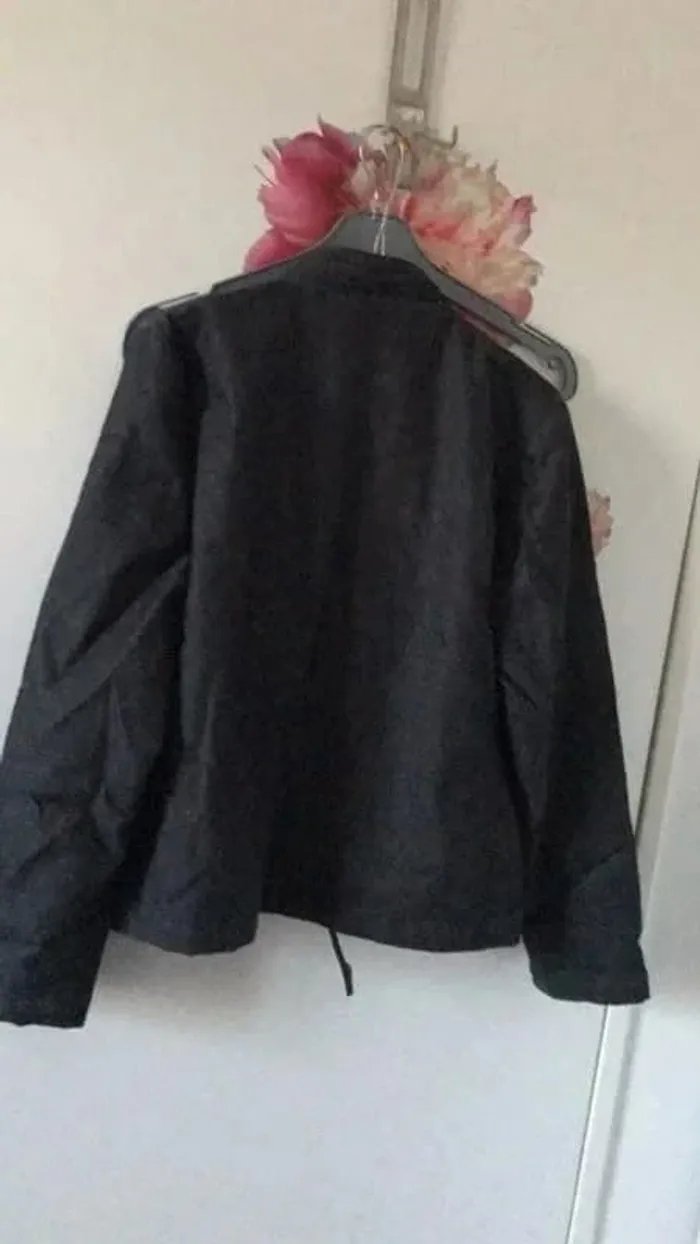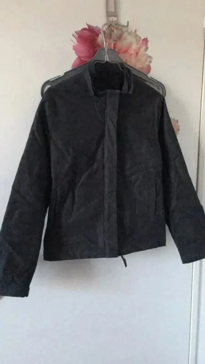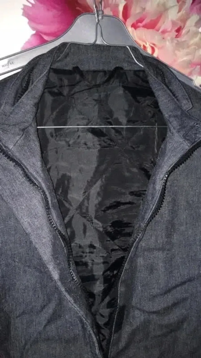 légèrement matelassé aspect jean bleu gris il y avait une capuche mais je ne l’ai plus très bon état