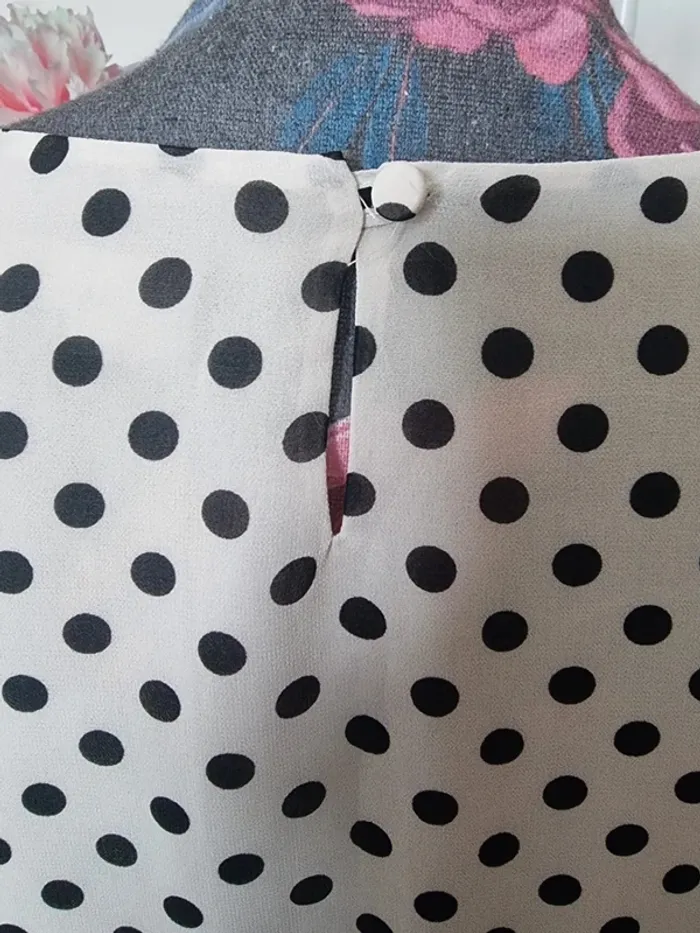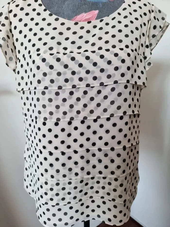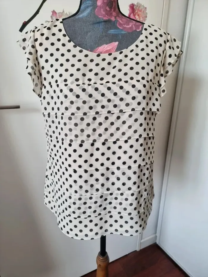 Magnifique top sans manches Couleur crème à pois noir Épaules volantées Superposition de bandes sur le devant Bouton en haut du dos Entièrement doublé 50 cm d'aisselle à aisselle 63 cm de hauteur totale à partir du haut de l'épaule Très peu porté état neuf
