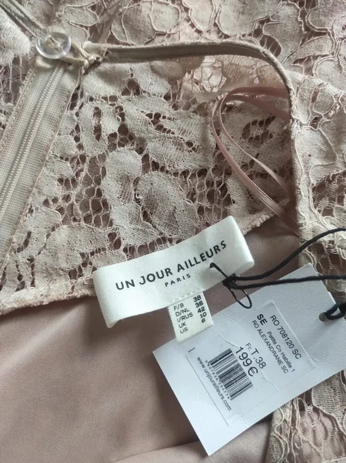 Magnifique robe chic en dentelle rose poudré 40%coton 30%polyamide 20%viscose entièrement doublée et cintrée fermeture invisible dos largeur d'aisselle à aisselle 49 cm longueur à partie de l'épaule 99 cm Neuve avec étiquette jamais portée valeur en magasin 199 euros