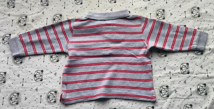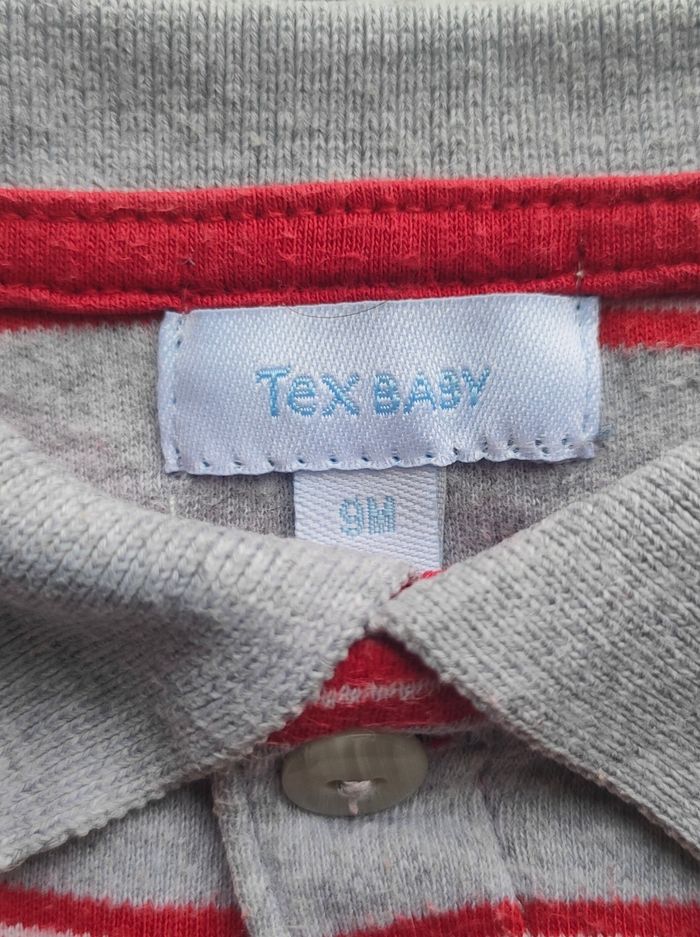 Tee-shirt ML rayé gris et rouge en bon état de la marque Tex Baby pour garçon taille 9 mois