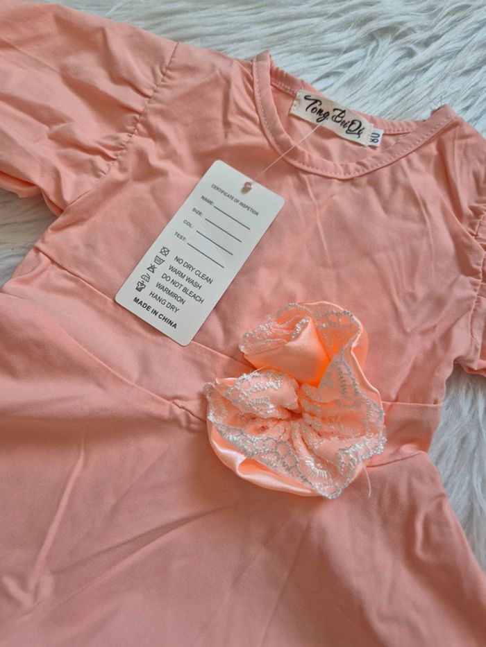 Robe rose élégante avec jolis détails en dentelle sur les manches et le bas. Grosse fleur décorative à la taille, pour une touche raffinée 💐 Neuve avec étiquettes – parfaite pour une cérémonie, un anniversaire ou une jolie occasion ✨ 📏 Taille : 80 (équiv. 18 mois) 📦 Envoi en petit format pour réduire les frais de port !