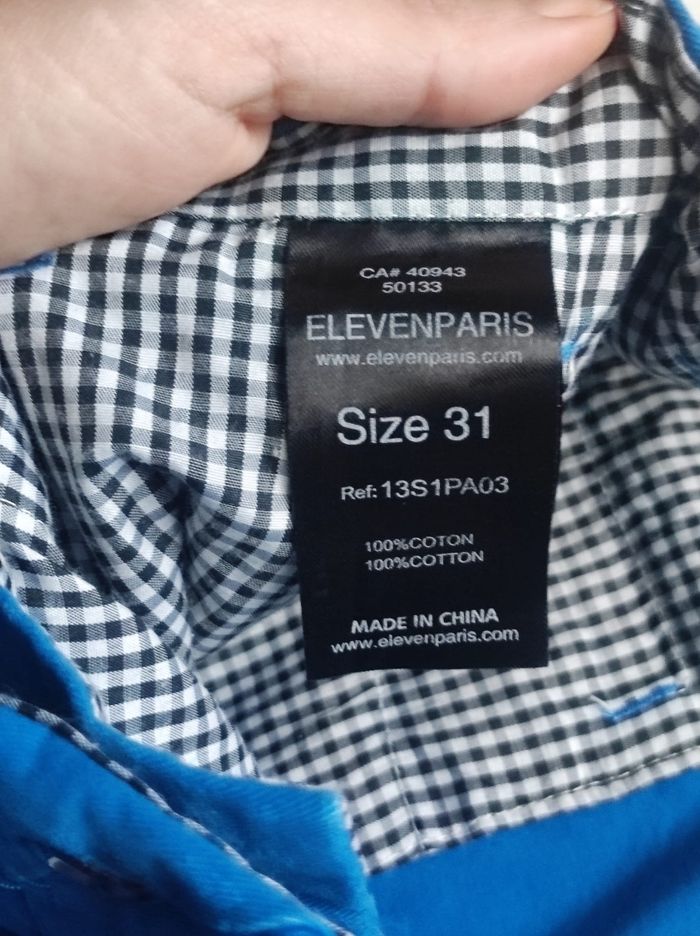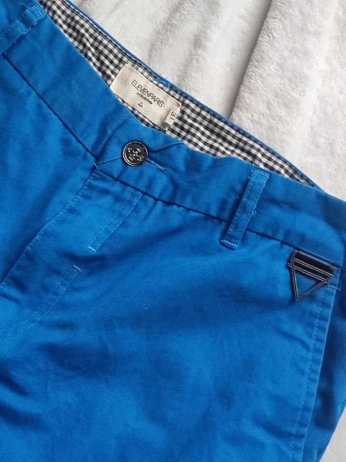 Pantalon chino a coupe droite, couleur bleu électrique. Marque elevenparis en taille W31 se qui correspond a un 40. 100% coton Peu porter en très bon état.