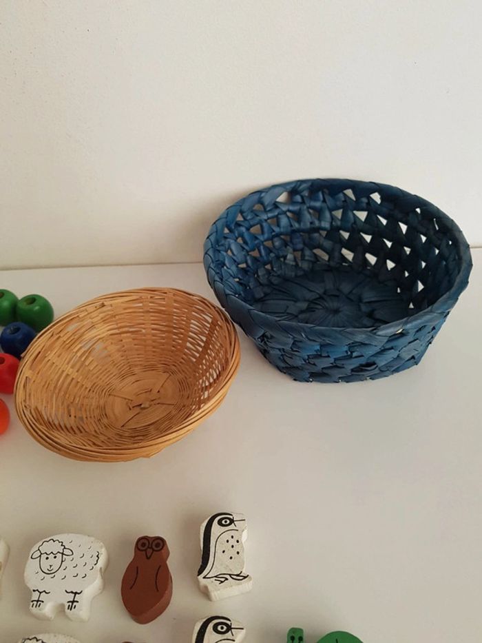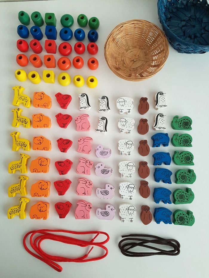 Lot de 56 perles à lacer en bois sur le thème du zoo avec 2 lacets. Un jeu créatif montessori pour travailler la motricité fine avec des grosses perles en bois faciles à manipuler. • 30 perles colorées Un jeu de laçage ludique pour apprendre les couleurs (jaune, vert, bleu, rouge) et les formes (rond, carré...) • 55 perles vintage sur le thème de la nature et du parc zoologique 10 animaux : girafe, ours, poule, lapin, canard, pingouin, mouton, hibou, cochon et escargot • 2 paniers en osier pour ranger et trier les perles Diamètre du grand panier : 16 cm Diamètre du petit panier : 12 cm Largeur des perles carrées : 2 cm Hauteur des perles girafes : 4 cm Hauteur des perles oiseaux : 3 cm