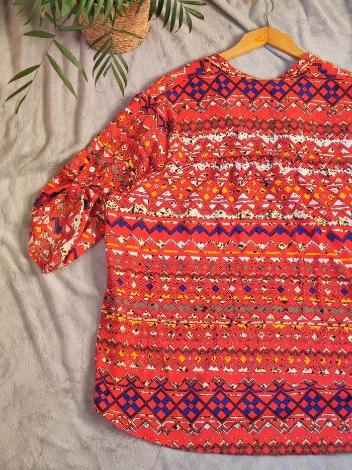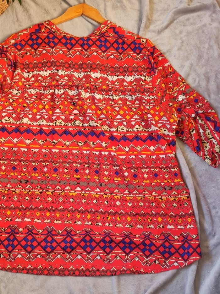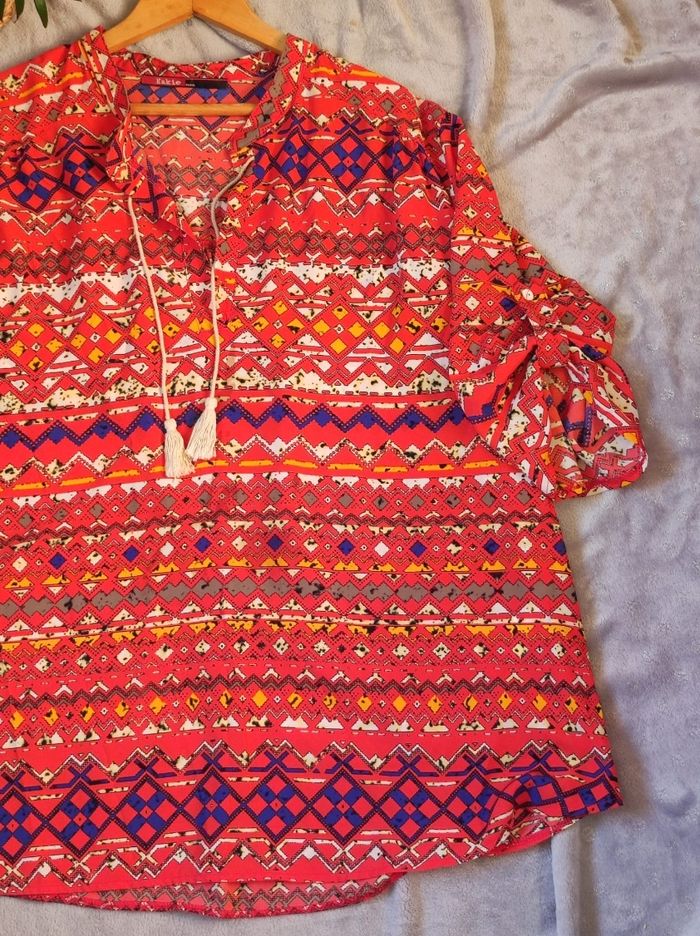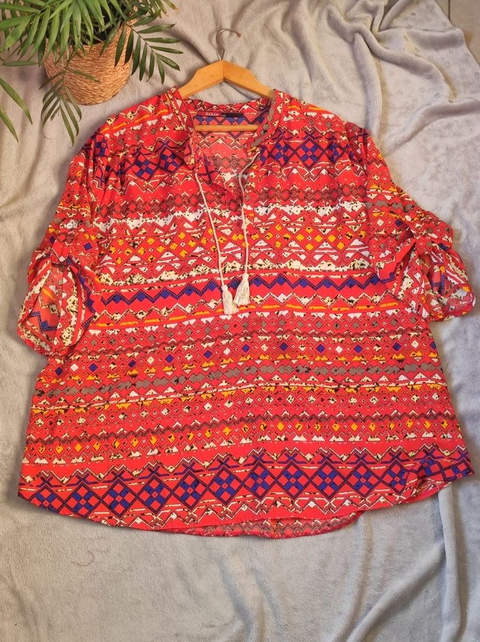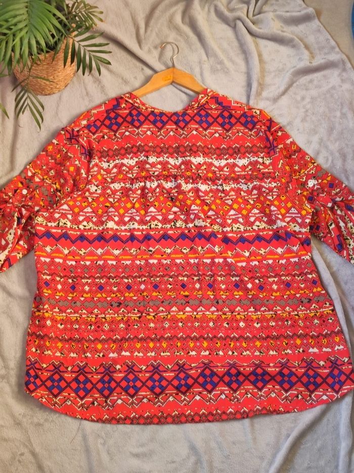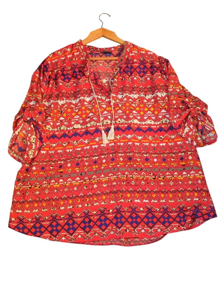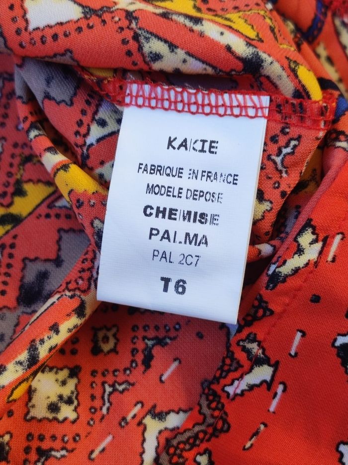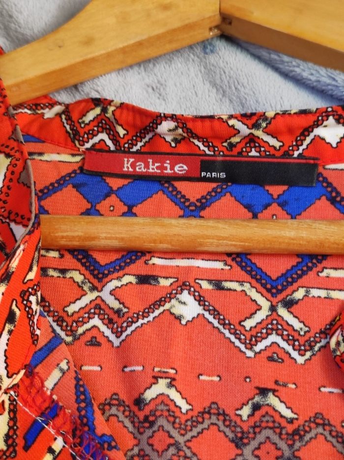 Blouse aux manches 3/4 qui se détachent, de la marque kakie mentionné T6 se qui correspond a un 52, matière 100% polyester. Grand col v ouvert avec deux ficelles à pompons. Matière fluide et légère.