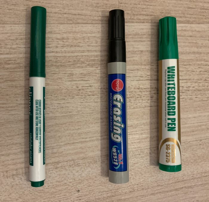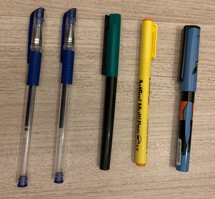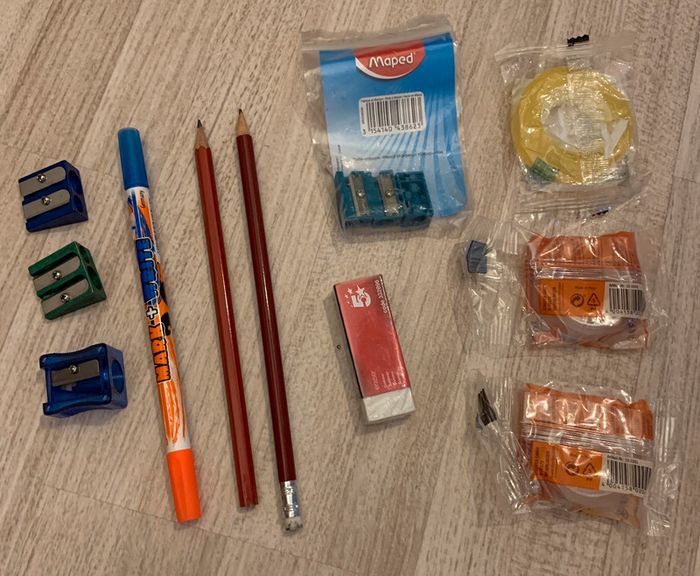 Lot divers avec stylos, feutre tableau blanc, effacer, flou, tailles crayons, etc. #laeta37_scolaire