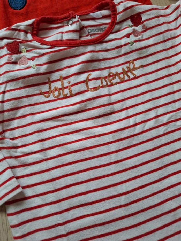 Lot de 2 t-shirts manches longues bébé fille : - "Joli cœur" à rayures rouges et blanches - Minnie avec patchs en relief Très bon état. Marque Orchestra. Taille 9 mois