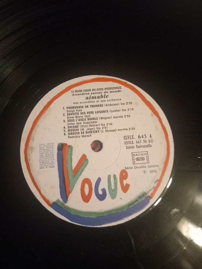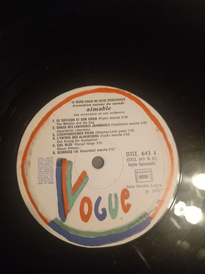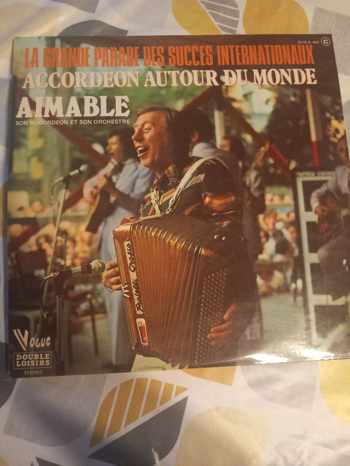 2 Disque vinyle 33 tours Titre : la grande parade des succès internationaux, accordéon autour du monde Artiste : Aimable son accordéon et son orchestre Face A 6 titres Face B 6 titres Face C 6 titres Face D 6 titres En bon état