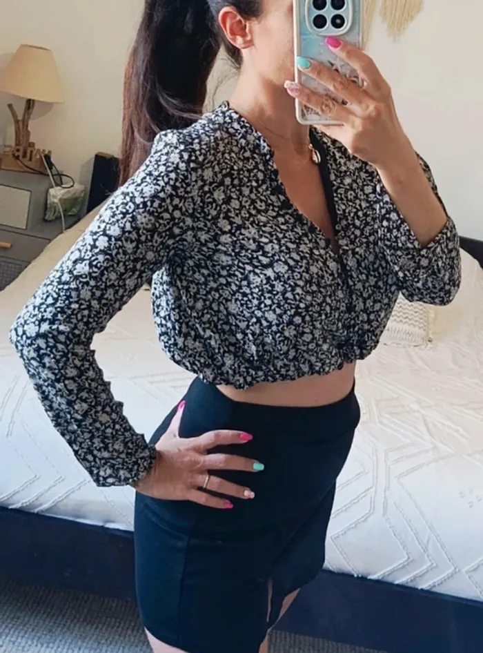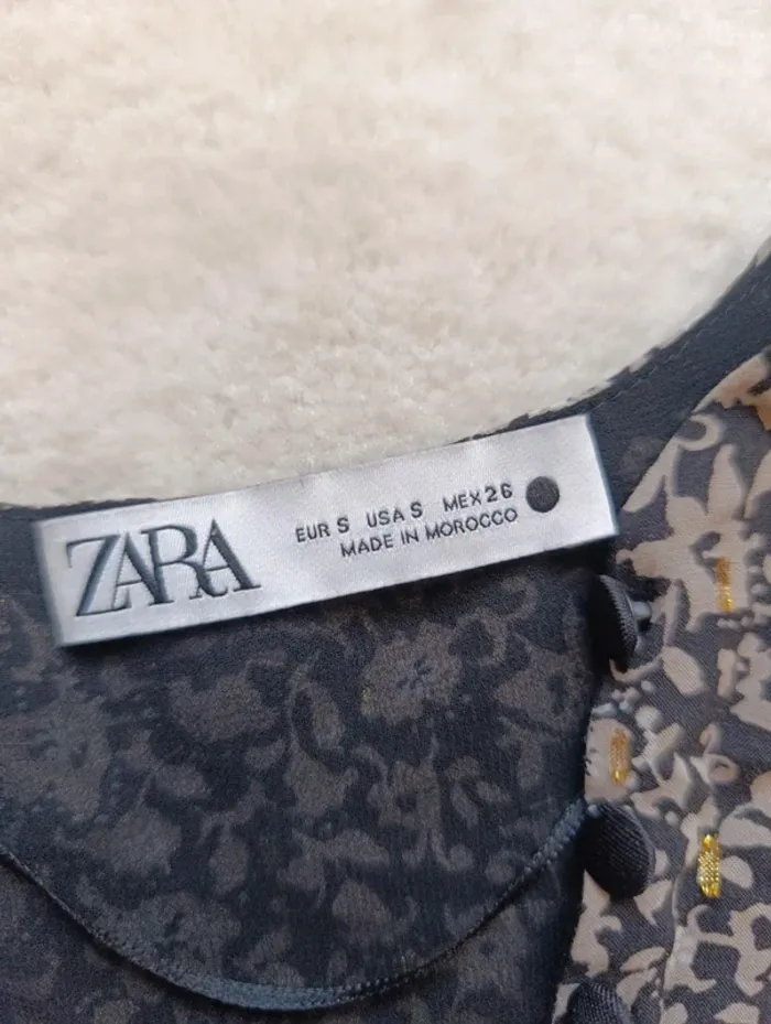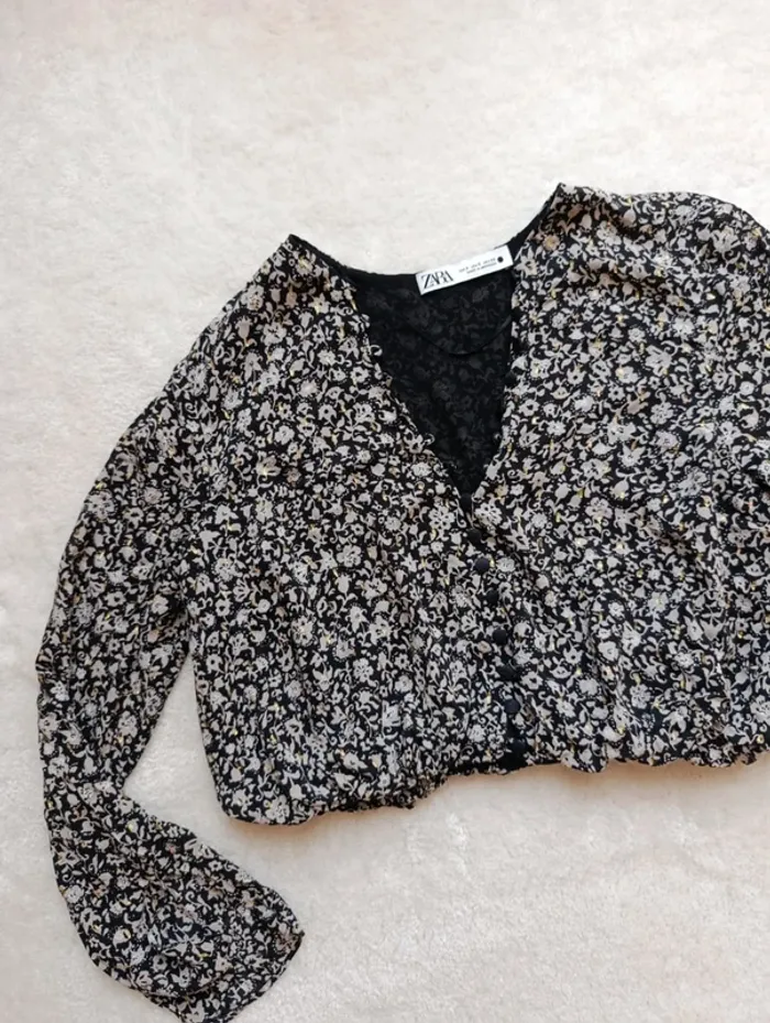 Top court chemisier blouse haut Zara S noir fleuri beige et doré léger fluide - photo numéro 1