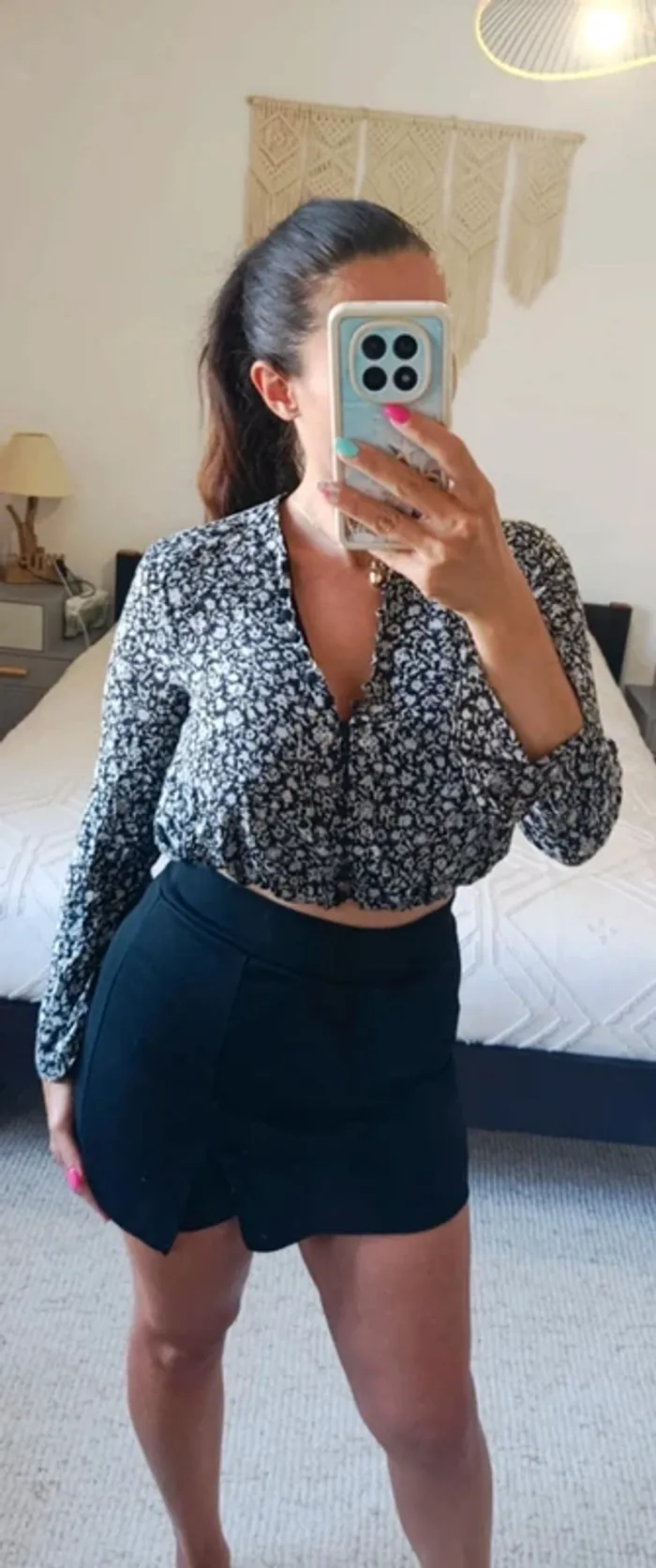 Top court chemisier blouse haut Zara S noir fleuri beige et doré léger fluide