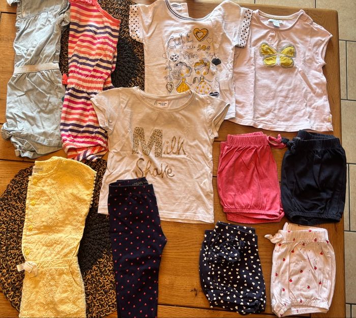 3 tee-shirts 4 shorts 3 combishorts 1 legging Taille 18-24 mois Bon état, soit mini taches ou mini trou pour certains Défauts très légers. Okaïdi, Kiabi, verbaudet etc..