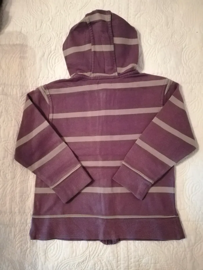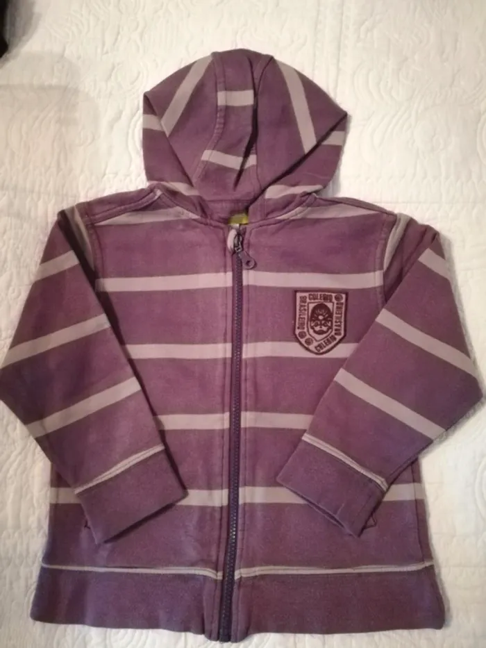 Sweat zippé garçon à capuche. Marque Vertbaudet. Bon état. Couleur violet et gris. Blason sur la poitrine.