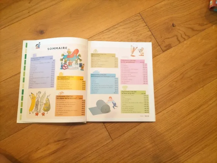 150 pages, sur les aliments, les vêtements, les objets de la maison, la maison, le transport et l'énergie, la vie quotidienne, la terre et la vie... En très bon état, couverture rigide, jolie illustration, pour des enfants, prix d'origine 16 €.
