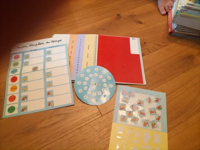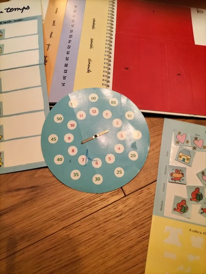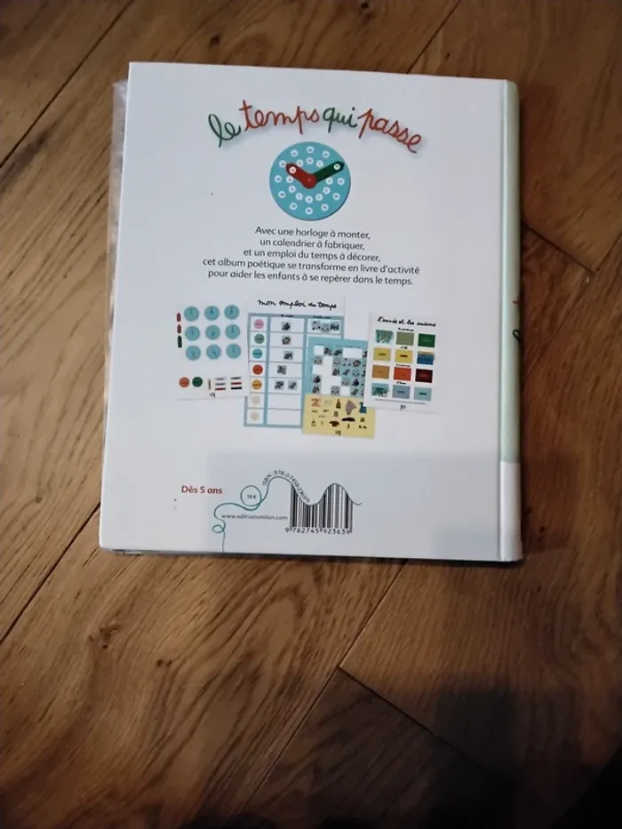 Tout pour apprendre le temps qui passe, à prendre à compter le temps, dès 5 ans, permet de placer des notions de temps avec un livre ludique, complet, des petits jeux des cachettes à soulever.... Livre en bon état, À noter : horloge à monter déjà faite et bien utilisée. Calendrier démarré mais non fait. Voir photos. Dès 5 ans. 14 € et le prix de base.