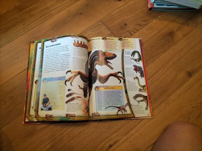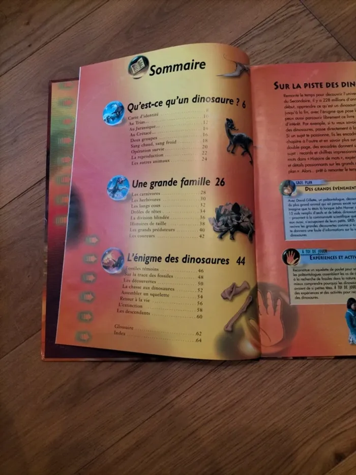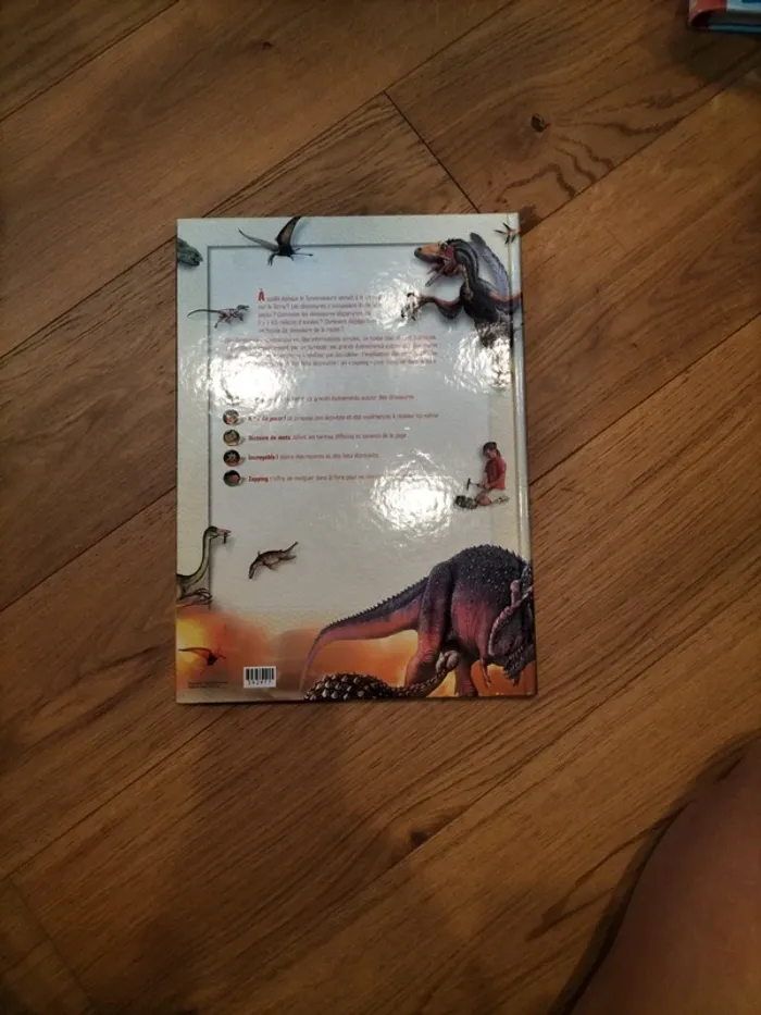 Livre documentaire, très grand format : Tout sur les dinosaures, les familles, l'énigme des dinosaures avec un glossaire à la fin et un index très complet... Façon encyclopédie ludique. Très bon état couverture rigide, coins légèrement abîmés jolie illustration et photos pour enfants.