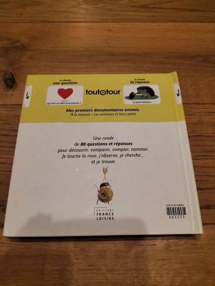 Superbe livre sur les animaux et leurs petits, dans différents milieux, Une édition Casterman dédié à France loisirs. On retrouve les animaux de la savane, de la mare, du pôle nord, de la forêt, de l'Australie et de la campagne... Livre interactif avec des questions et des réponses, dans des pages qui sont en forme de roue et tournent... En parfait état.