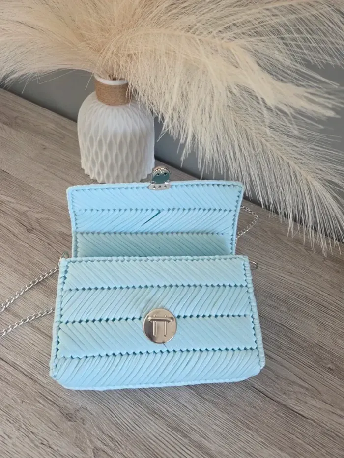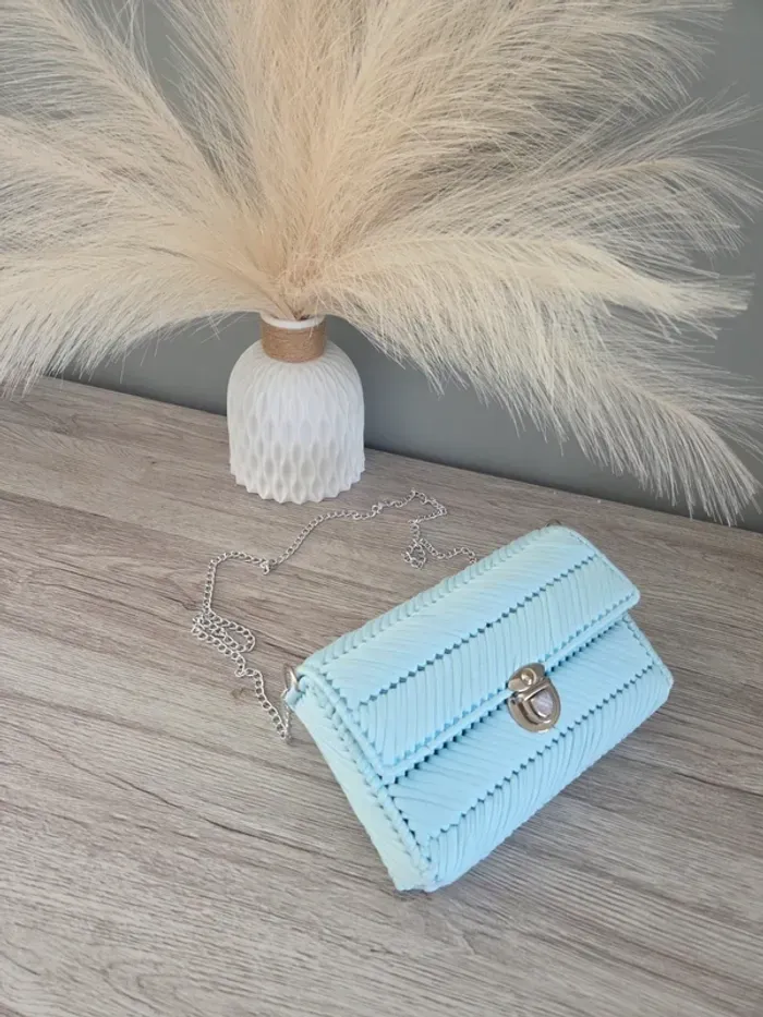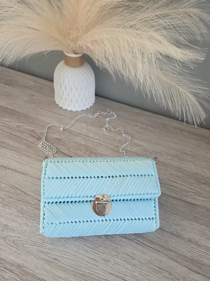 Sac Bleu Céleste Plongez dans la douceur du ciel d’été avec Bleu Céleste, un sac entièrement réalisé à la main avec amour. Son tressage en ruban offre une texture raffinée et originale, tandis que son fermoir argenté ajoute une touche d’élégance. Parfait pour une sortie chic ou pour sublimer un look quotidien, Bleu Céleste est un accessoire à la fois délicat et intemporel. > Dimensions approximatives : 19cm de longueur 13cm de hauteur 4,5cm de largeur Fait main – Pièce unique