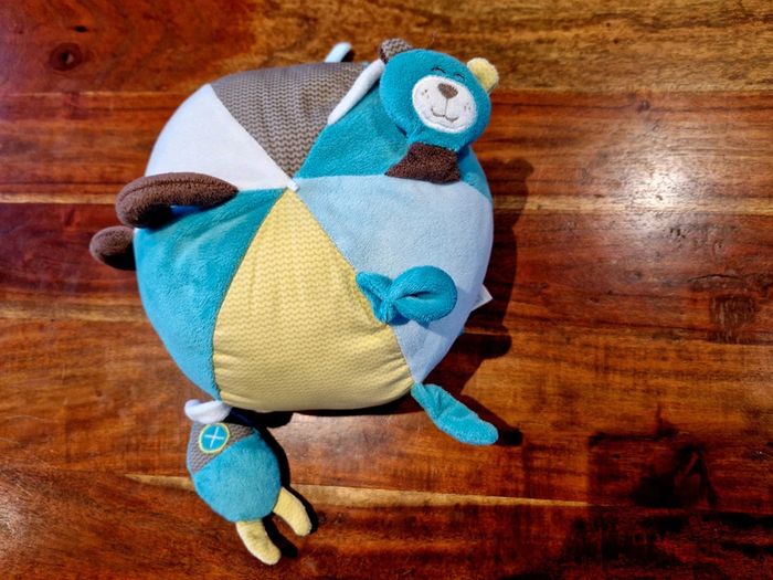 Balle d’activité comprenant un "pouêt-pouêt", un miroir et un grelot intérieur qui fait du bruit quand on secoue la balle. Très bon état
