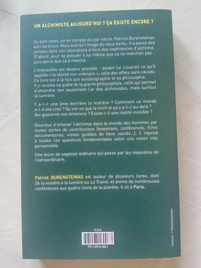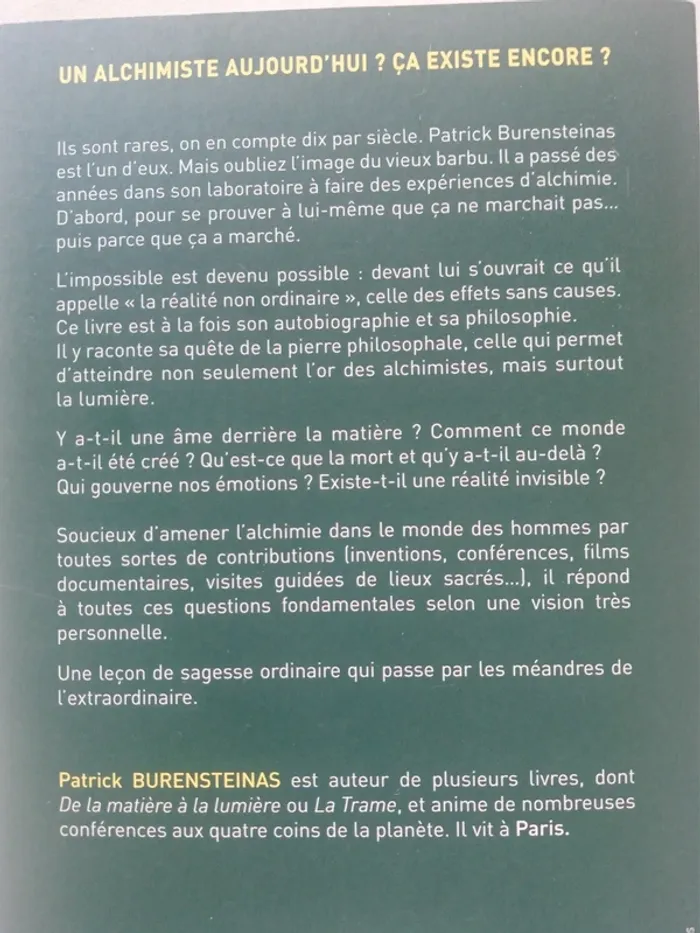 Un alchimiste raconte Patrick BURENSTEINAS Massot Editions (2017) 320 Pages, broché Très bon état Alors que notre société s'ouvre aux spiritualités du monde voici un moyen de se reconnecter avec forme de spiritualité pratiquée en France depuis des siècles. Ils sont rares, on en compte dix par siècle. Patrick Burensteinas est l'un d'eux. Mais oubliez l'image du vieux barbu en cape violette. Scientifique de formation, il a passé des années dans son laboratoire à faire des expériences d'alchimie opérative au creuset. D'abord, pour se prouver à lui-même que " ça ne marchait pas "... et puis parce que ça a marché. L'impossible est devenu possible. Il y aurait donc une âme derrière la matière ? C'est vers un or tout autre que s'est tournée sa quête. Une quête de lumière d'ordre métaphysique. Car c'est en oeuvrant à être soi-même " aligné " que l'on parvient à la pierre philosophale. Aujourd'hui, c'est cet éveil qu'il souhaite transmettre au plus grand nombre. Après avoir réalisé des documentaires filmés, de nombreuses conférences et des voyages initiatiques sur des lieux sacrés, il est désormais contacté pour du conseil par des grandes marques, soucieuses de donner du sens à leurs produits. L'alchimie a beau être multimillénaire, c'est un art qu'il souhaite mettre au coeur de la cité des hommes et en prise avec notre époque. Ce livre raconte le parcours de ce chercheur d'or, ce qui a présidé à sa création, pourquoi nous sommes là, ce qui nous attend après la mort, mais aussi ce qui gouverne nos émotions et de quelle façon nous pouvons tendre, nous aussi, vers la lumière qu'est la paix intérieure. Une leçon de sagesse ordinaire qui passe par les méandres de l'extraordinaire.