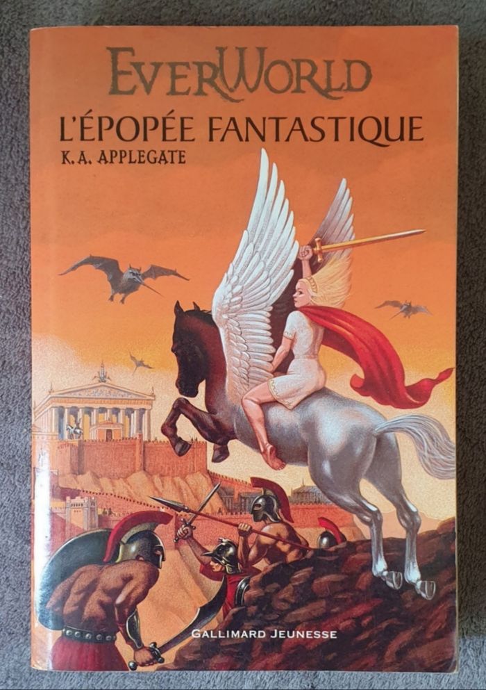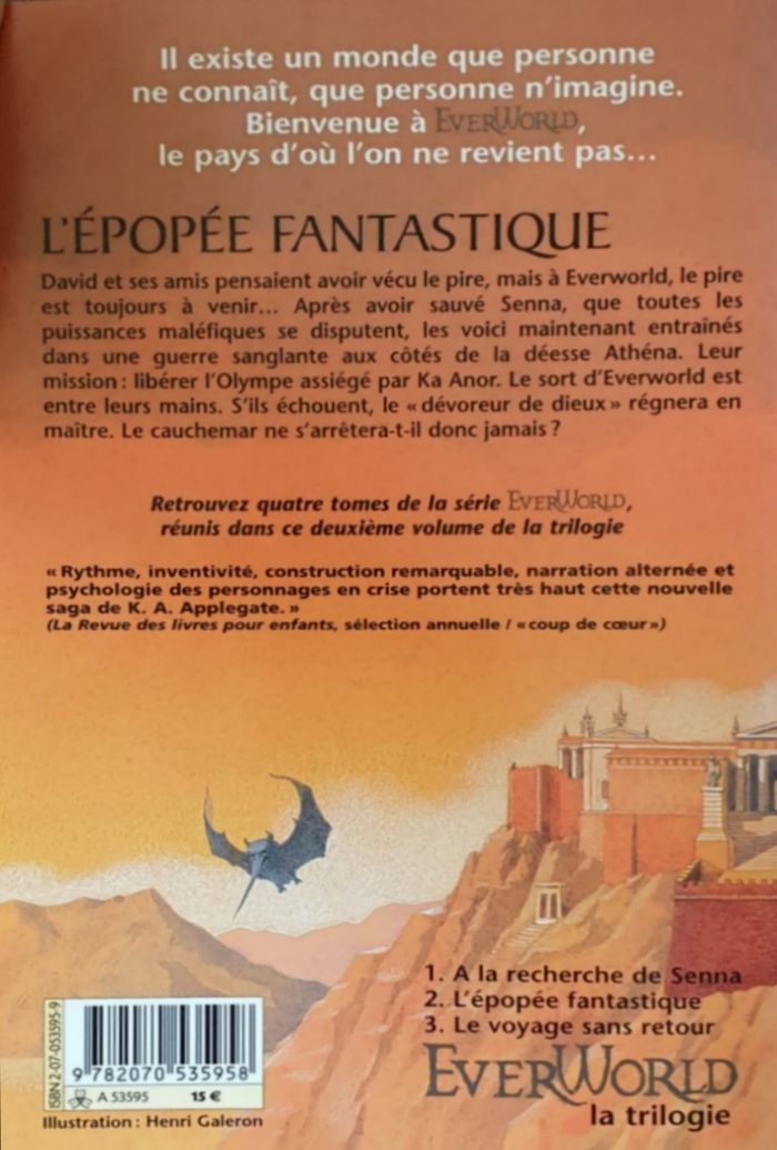 Résumé : David et ses amis pensaient avoir vécu le pire mais à EverWorld, le pire est toujours à venir.. Après avoir sauvé Senna, que toutes les puissances maléfiques se disputent, les voici maintenant entraînés dans une guerre sanglante aux côtés de la Déesse Athéna. Leur mission : Libérer l'Olympe assiégée par Ka Anor. Le sort d'EverWorld est entre leurs mains. S'ils échouent, le «Dévoreur de Dieux» régnera en Maître. Le cauchemar ne s'arrêtera-t-il donc jamais ?.. Date de parution : Juin 2002. Auteur : Katherine A. Applegate. Illustrateur : Henri Galeron. Collection : Hors série. Éditions : Gallimard Jeunesse. =) 640 pages. Montant d'achat magasin : 15E. État comme neuf.