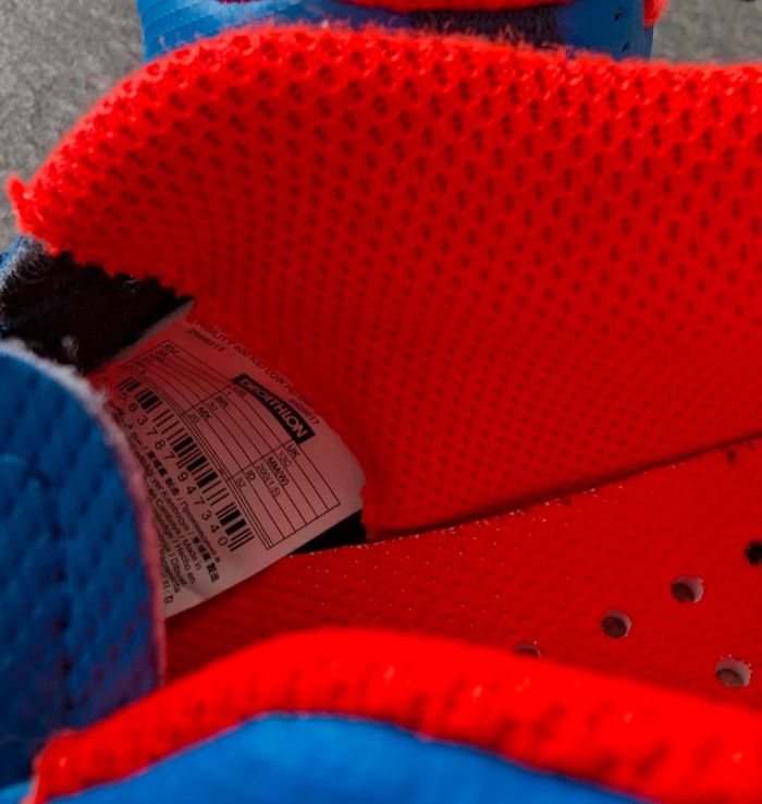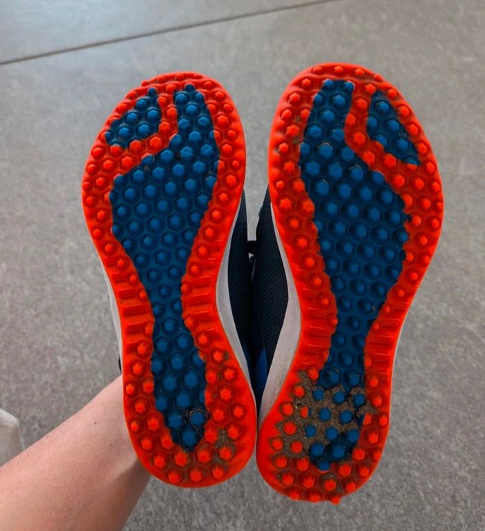 Chaussures de foot d'intérieur À enfiler et scratchs Taille 32 Blanc, bleu marine et orange Marque Kipsta by Decathlon Chaussures de foot Football #tiffanyostertag_garçon6ans #tiffanyostertag_garçon7ans #tiffanyostertag_chaussuresgarçon32