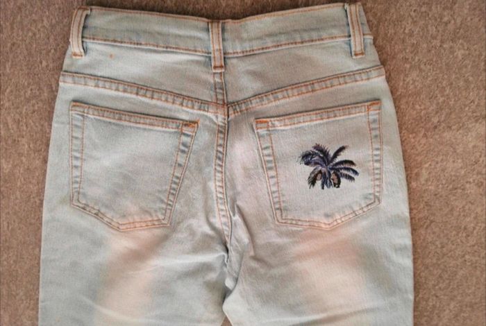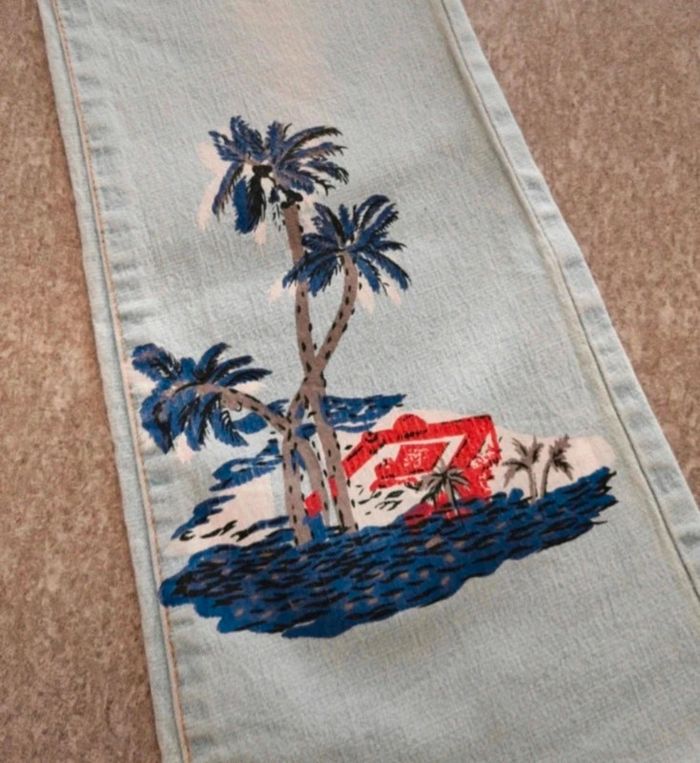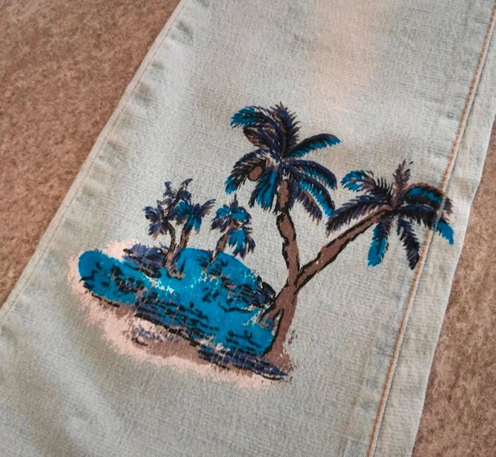 Pantalon jean clair à jambes larges Porté 1x comme neuf Pantalon d'été Printemps Palmiers peints dessus Jean évasé Taille 36 #tiffanyostertag_femmeS36