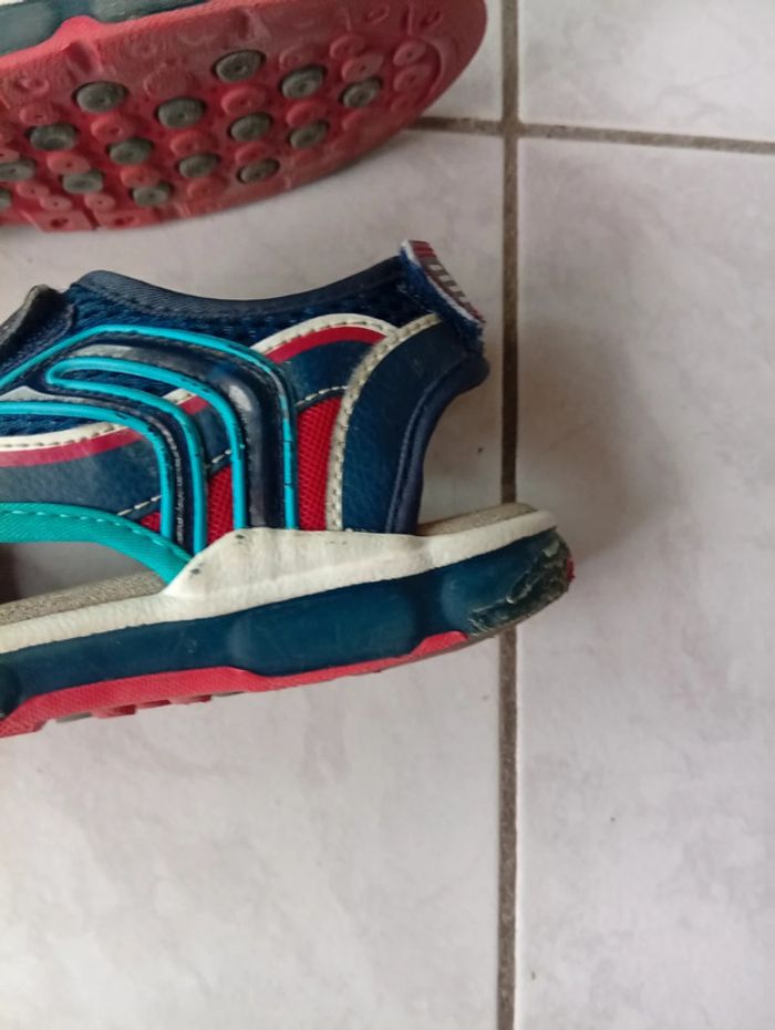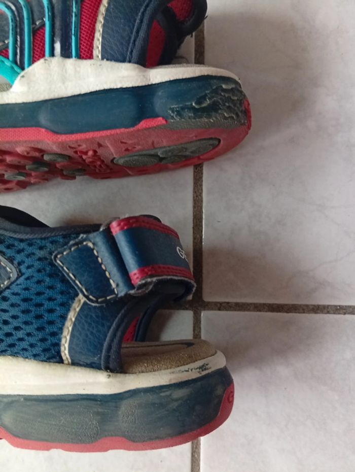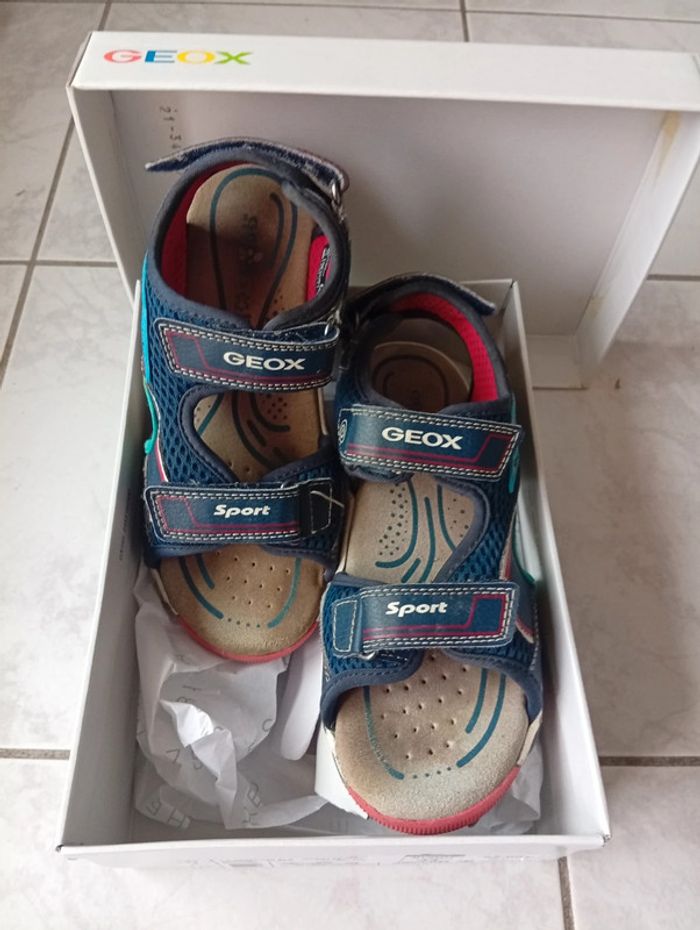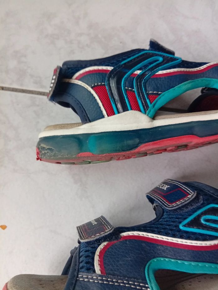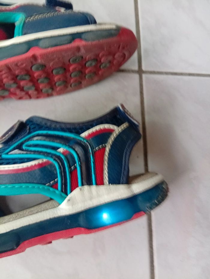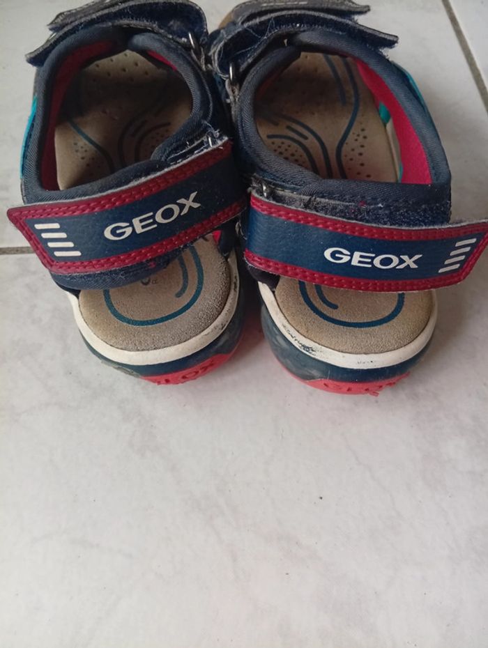 Sandale garçon de la marque GEOX . réglable au niveau du talon à scratch. Taille 34 , lumineuse au niveau de la semelle du talon . Marqué au niveau de la semelle et frotté au talon voir photo mais peuvent encore dépanner .