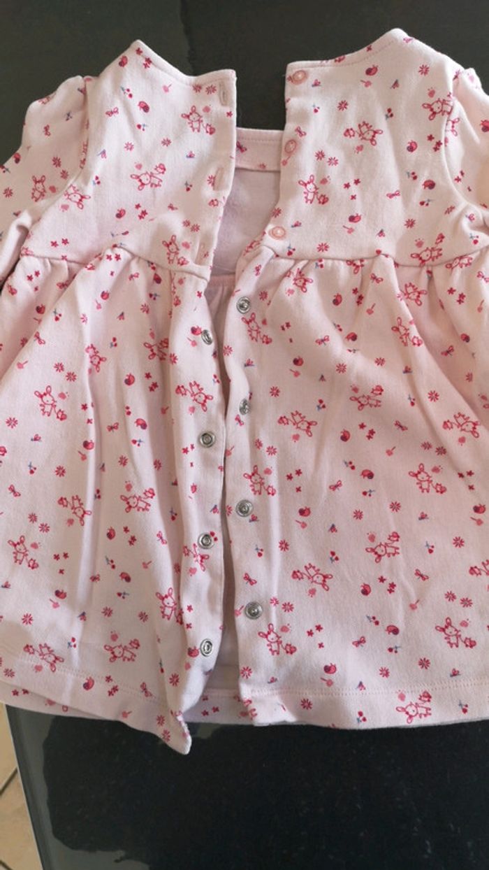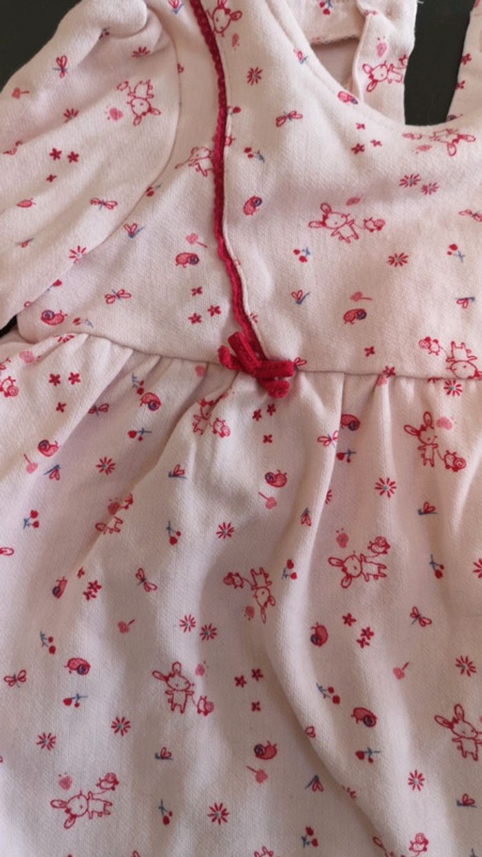 Robe chaude 24 mois 86 cm Taille un peu plus petit. Rose avec motif lapin et fleurs Se ferme par boutons et pressions dans le dos Comme neuve aucun défaut