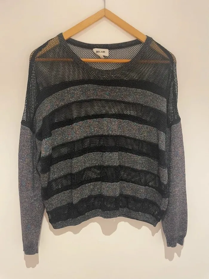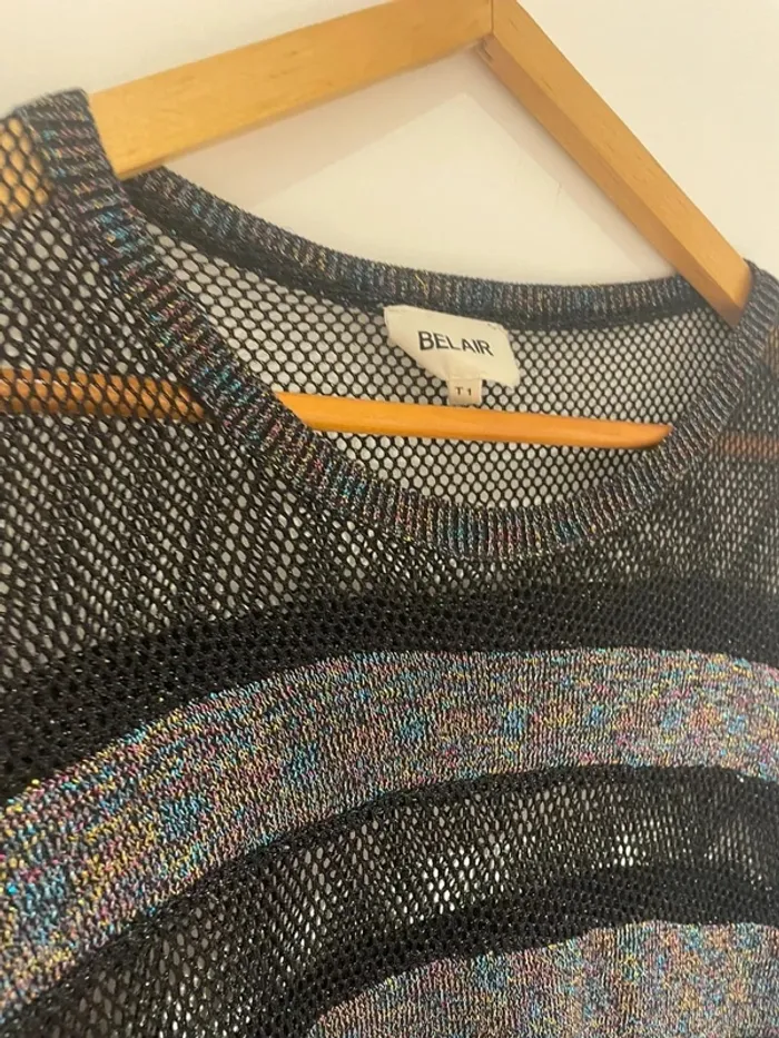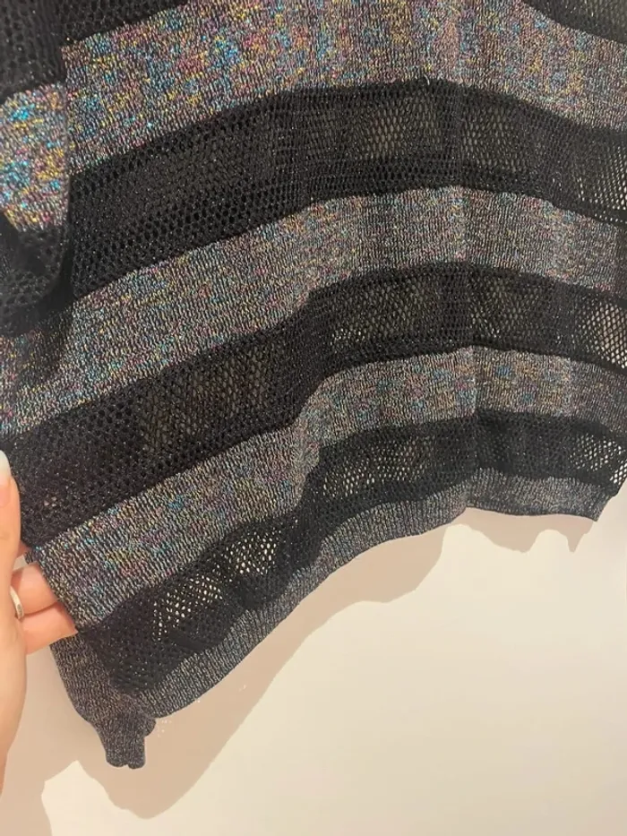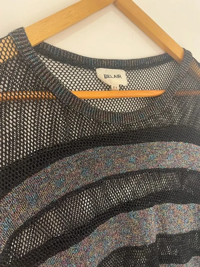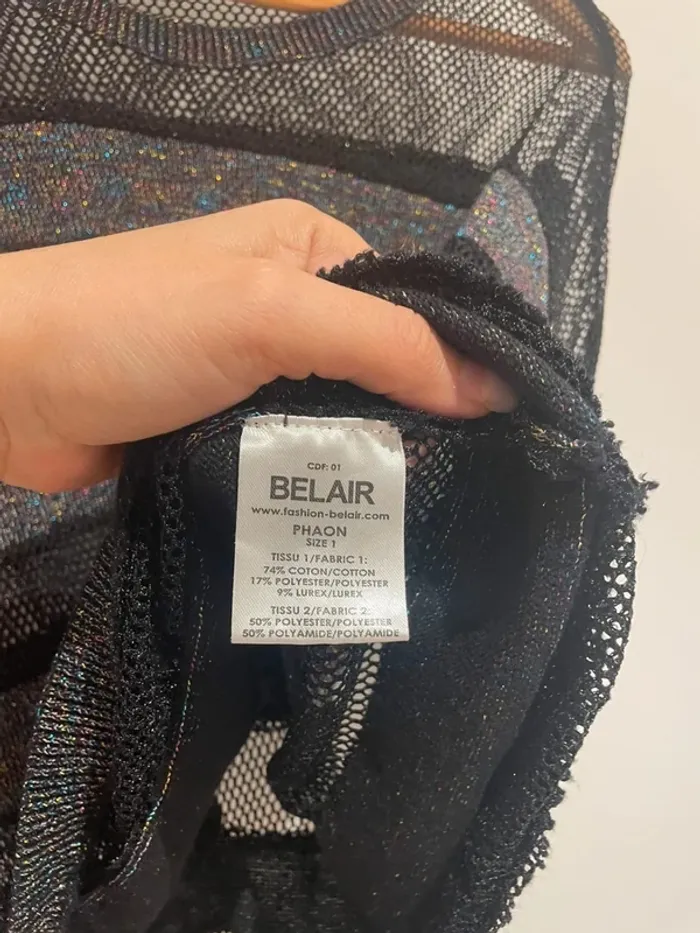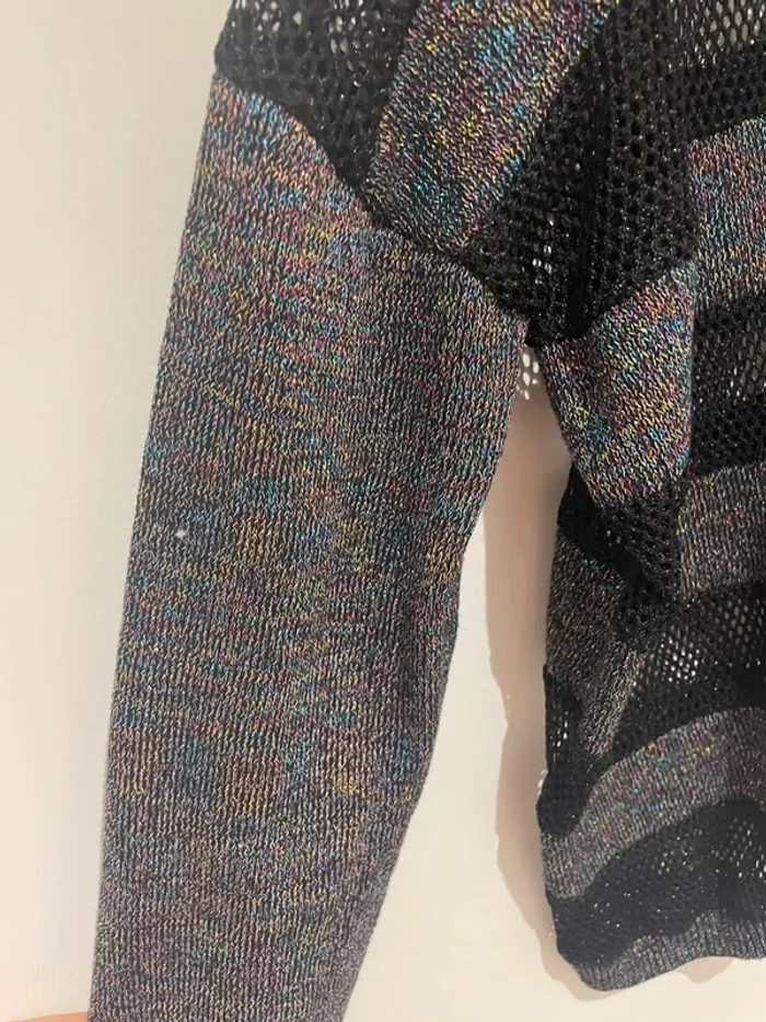 Haut manches longues model phaon taille 1 correspond à du S/M idéal pour les fêtes de fin d’année avec détails résilles et fils de couleurs pailletés en alternance pour un effet festif et élégant