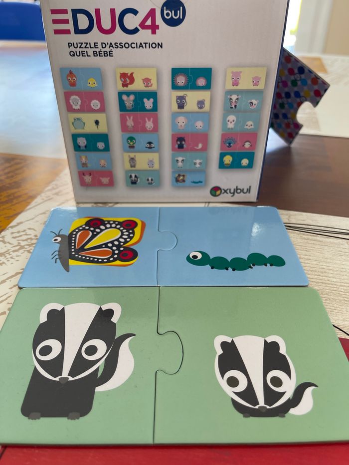 Puzzle d’association bébé parents Ce jeu permet l’association autocorrectif apprend au petit à reconnaître et mémoriser les animaux et leurs bébés. Variante et évolution du jeux possible