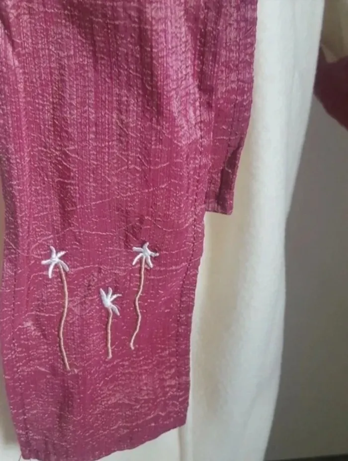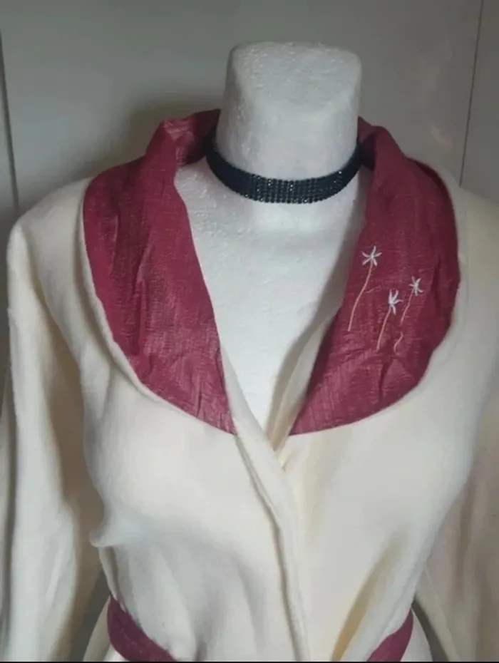 Beau peignoir de couleur écru avec col satiné bordeaux brodé ainsi que la ceinture et le bas des manches. Taille 40, mais plus l'étiquette de taille, matière toute douce en polyester. Elle est en très bon état, très peu porter. Ce ferme par une ceinture à nouer devant. #vetements40_audreyhei #vetements38_audreyhei #vetementsTU_audreyhei