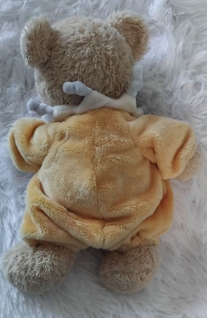 Doudou peluche ours en velours poils de couleur beige. Vêtu d'une combinaison en velours de couleur jaune avec papillon , nuage et girafe brodé dessus. Ours qui mesure 26 cm env