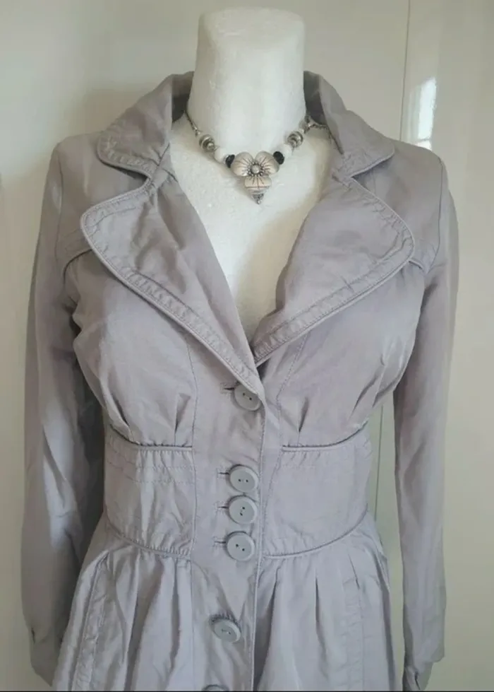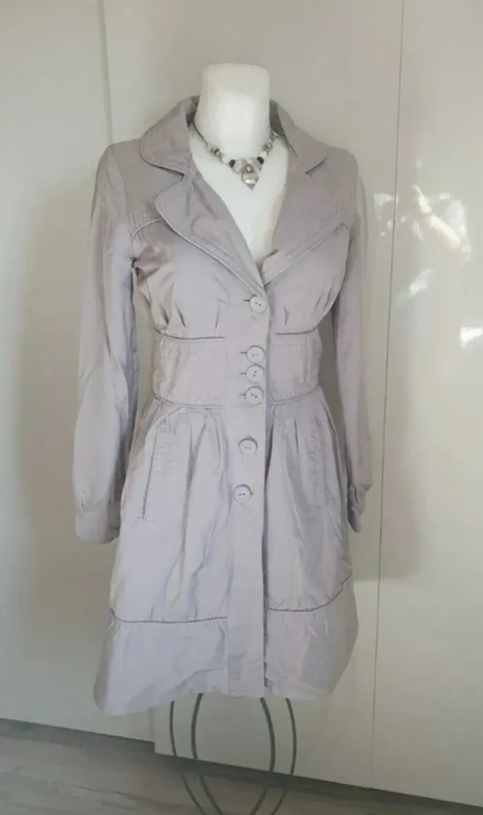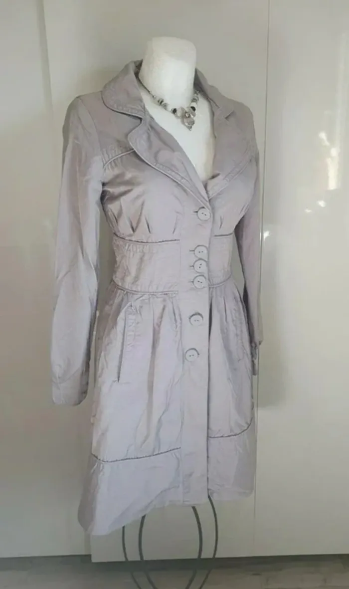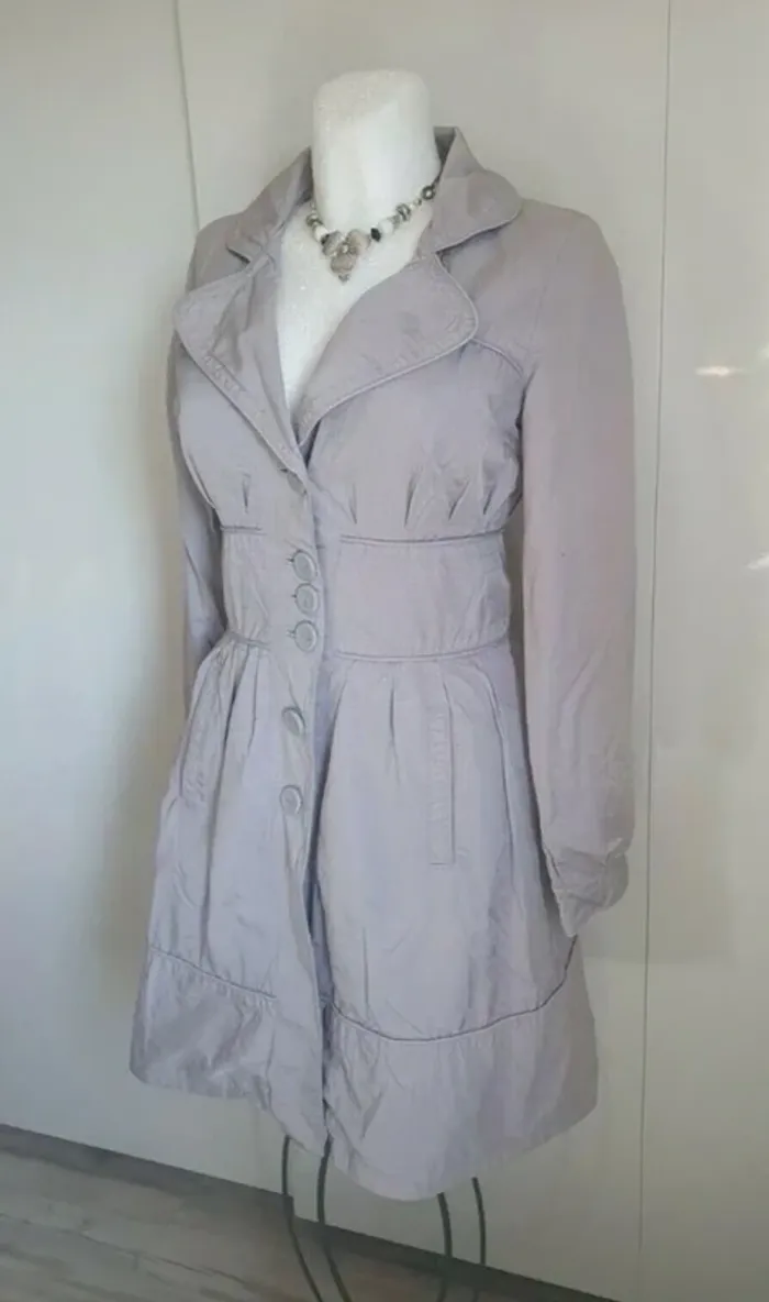 Beau trench léger pour le printemps, été de couleur gris légèrement satiné, marque VERO MODA de taille indiqué S pour un 36/38 (mais voir les mesures). Effet large ceinture à la taille, ce ferme par de gros boutons, deux poches, légèrement doublé. Matière coton et nylon. Aisselle à aisselle 45 cm, épaule à épaule 40 cm, longueur 90 cm, manches 62 cm. Il est en très bon été très peu porter cause prise de poids. N’hésitez pas à regarder mes autres ventes de vêtements en cliquant sur le liens avec la taille qui correspond à votre recherche #vetements36_audreyhei #vetements38_audreyhei Tous mes articles sont trouvable en clonâtes sur le liens correspondant que vous trouverez dans ma biographie .