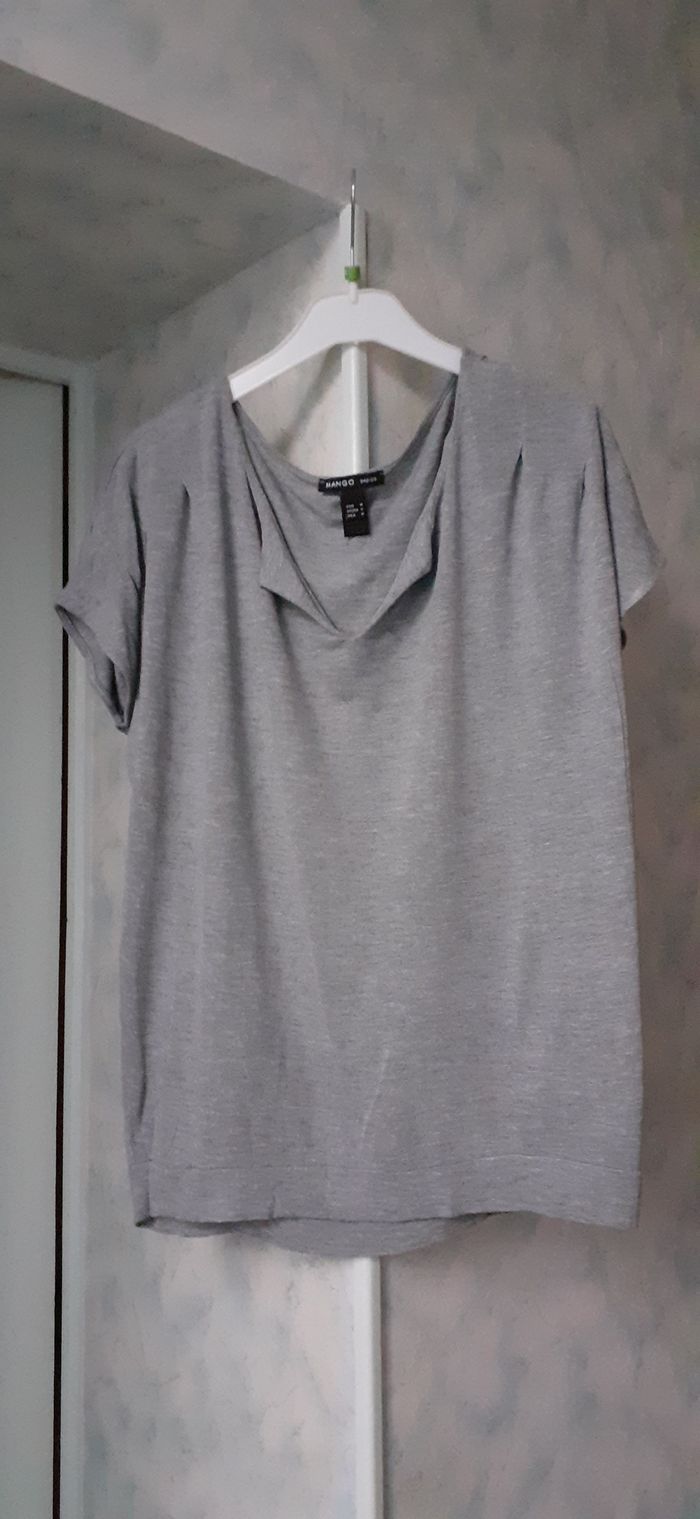 Vends un tee-shirt manches courtes, resserré à la base par un bandeau, en coton, viscose et élasthanne, couleur gris uni, marque Mango, taille M sur l'étiquette mais peut convenir à une taille 40. Longueur dans le dos : 62 cm Largeur aisselle à aisselle : 64 cm Largeur au niveau du bandeau à la base : 47 cm.