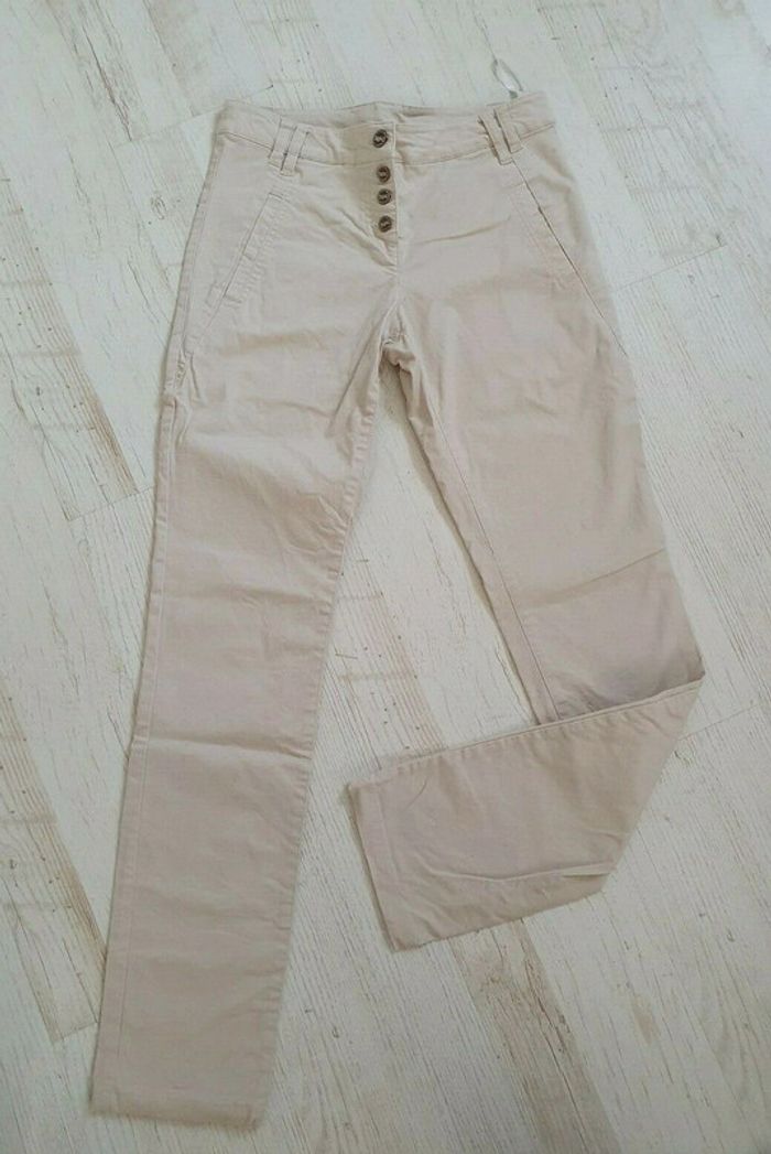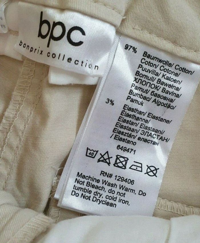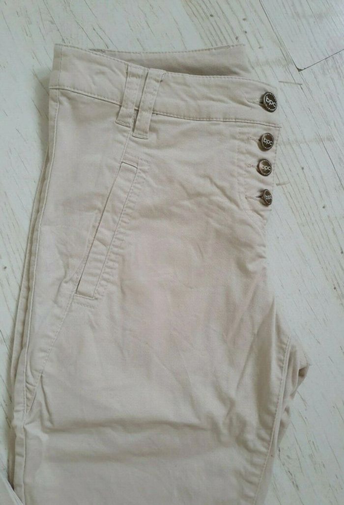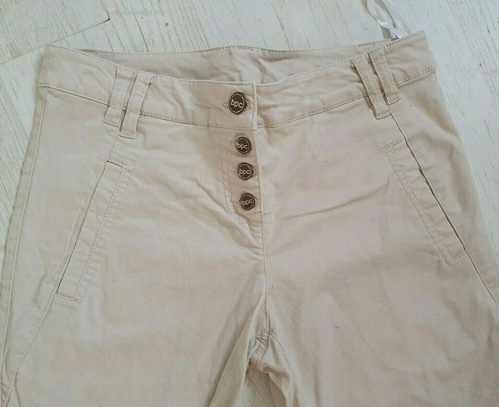 Beau pantalon stetch beige, marque Bonprix, taille inscrit 38 (voir les mesures). Ce ferme par braguette à boutons visible, boutons, 2 poches coté devant et deux à l'arrière. Matière 97% coton, 3% élasthanne. Il est en très bon état. Taille à plat sans tiré 37 cm, longueur 104 cm, entrejambe 80 cm, hauteur devant de la couture de l'entrejambe au haut de la ceinture 22cm, bas du pantalon 16cm. #vetements38_audreyhei