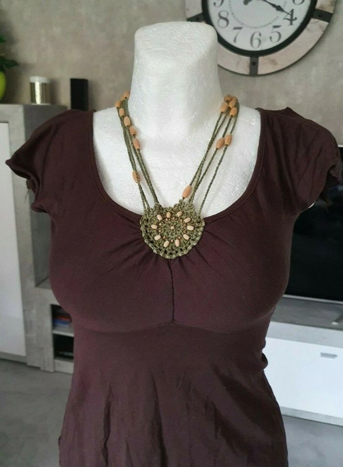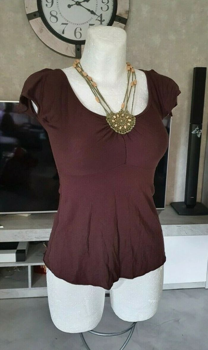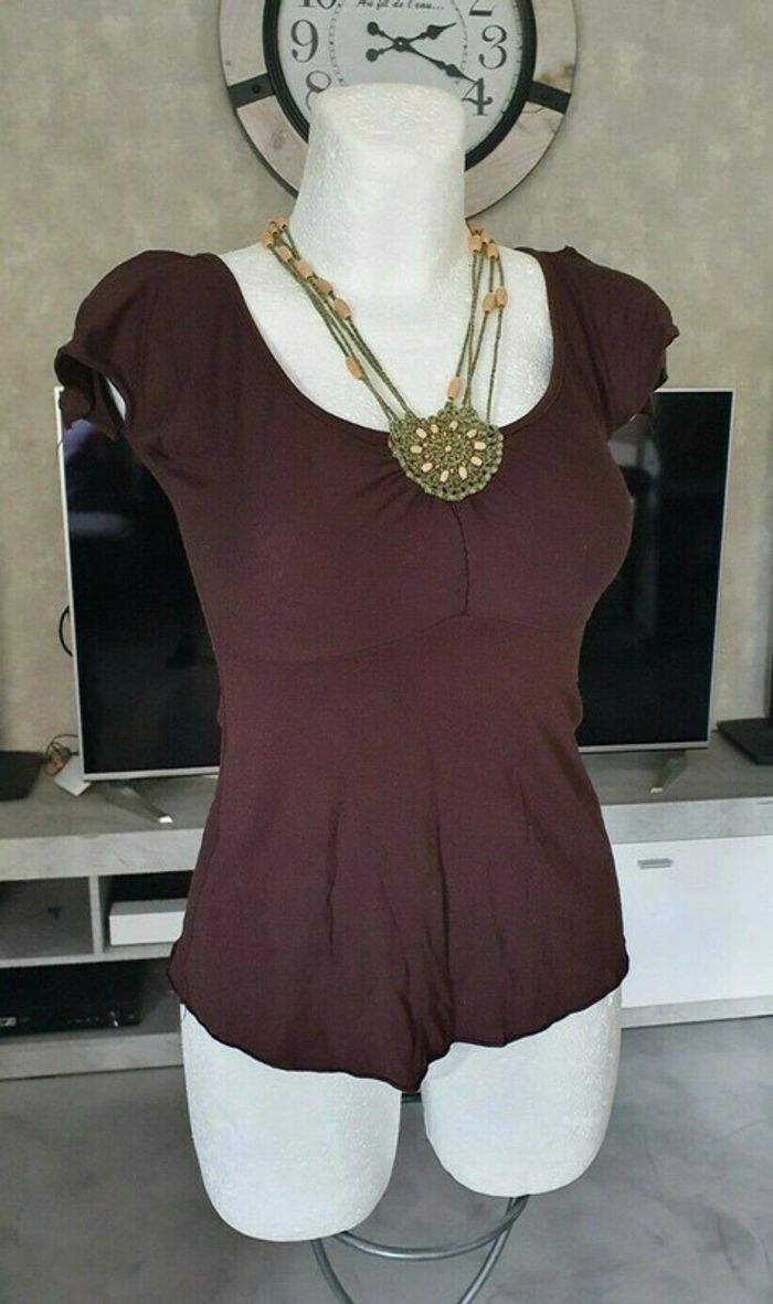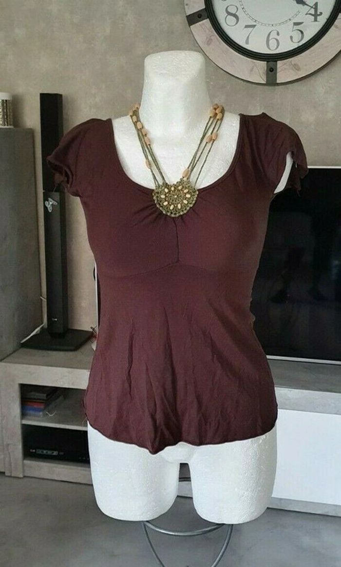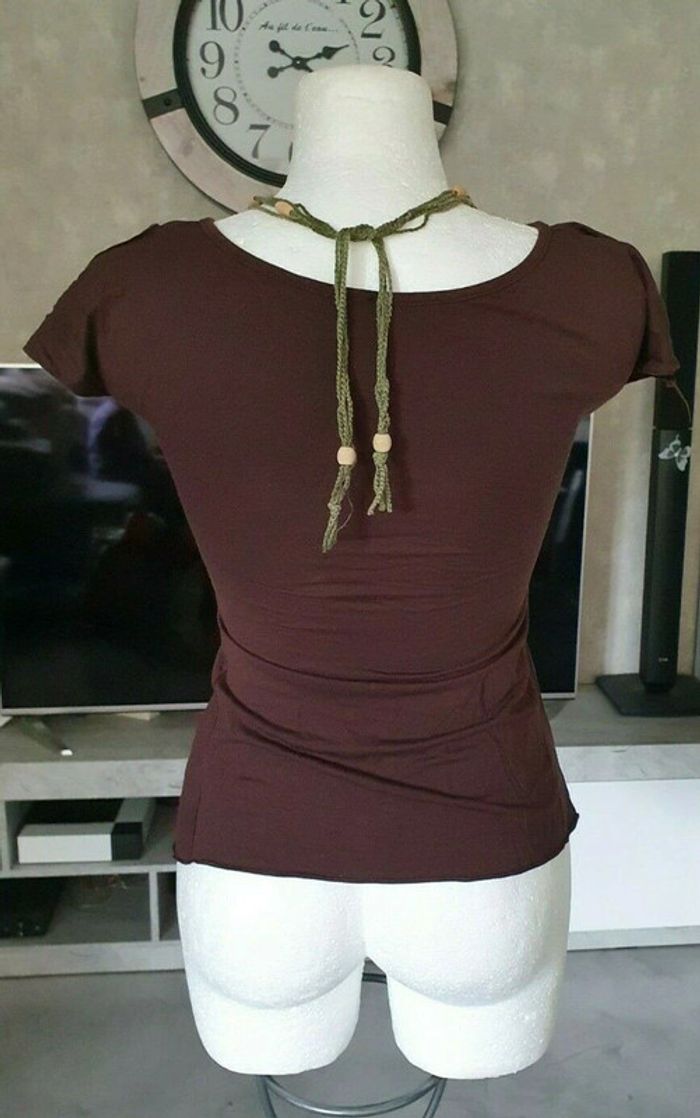 Beau T-shirt marron marque N & c B de taille 1 pour un 36. Matière viscose et élasthanne. Lien avec perles à nouer au cou. Les perles bouge donc vous pouvez les mettre tous ensemble devant au niveau du décolleté ou les laisser une par ci une par la comme sur la photo. Il est en très bon état mis à part un minuscule petit trou au bas du dos que j'ai réparer sur l'envers et cela ne ce vois pas du tout porter. (Voir 2 dernières photos en grand plan). Manches courtes. #vetements34_audreyhei #vetements36_audreyhei #vetements38_audreyhei #vetementsTU_audreyhei