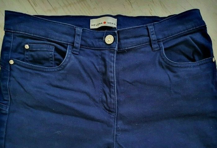 Pantalon bleu marque Helena Vera taille 18 Allemande voir 38 Français (mais voir les mesures). Matière 91% coton, 6% polyester, 3% élasthanne. Se ferme par un bouton et un zip, poches devant et deux à l'arrière. Il est en très bon état. Taille à plat 37 cm, longueur 96 cm, entrejambe 72 cm, hauteur devant de la couture de l'entrejambe au haut de la ceinture 24 cm, bas 15,5 cm #vetements38_audreyhei