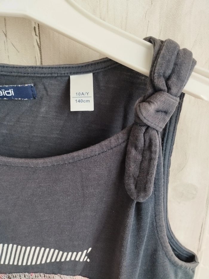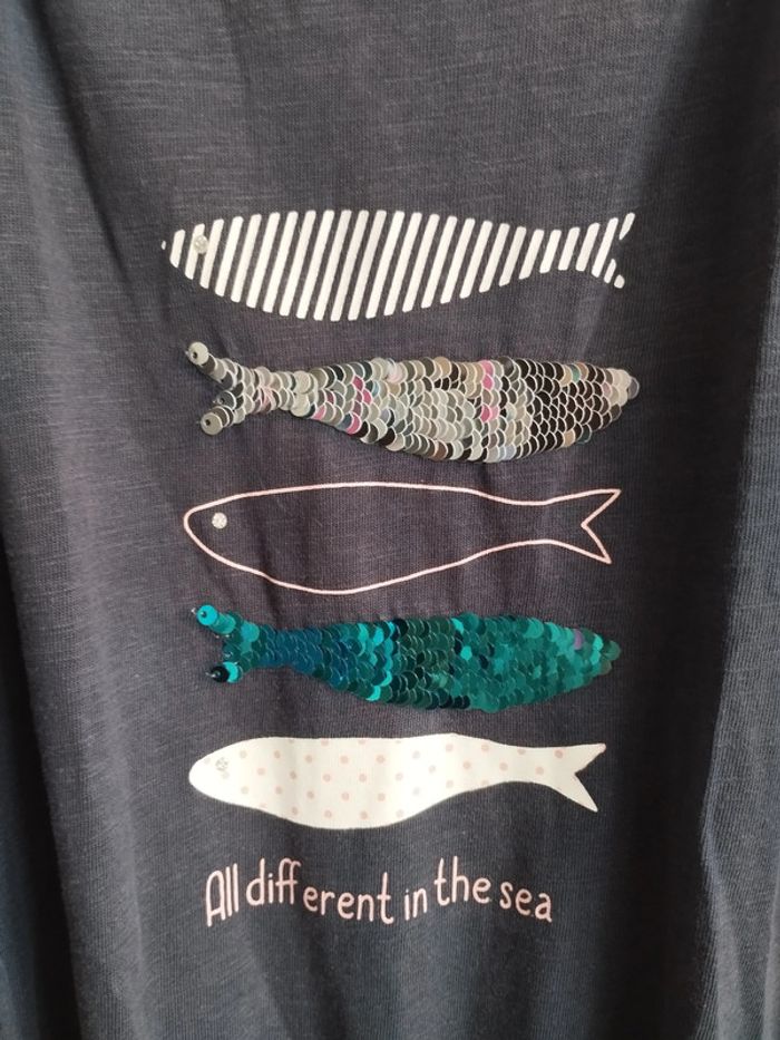 Robe d'été à bretelles larges, en coton de chez Okaïdi, en taille 10 ans. Bon état. Ceinture resserré avec poissons floqués et d'autres en sequins réversibles. Marine chiné #rosered16fille #10arosered16