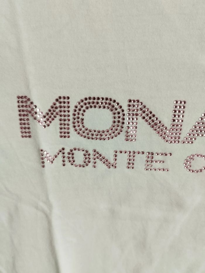 T-shirt crème, écriture Monaco et strass lilas, en taille 14 ans. Comme l'étiquette est effacée, de visuel je dis 14 ans mais je peux le mesurer si besoin. #rosered16fille #14arosered16
