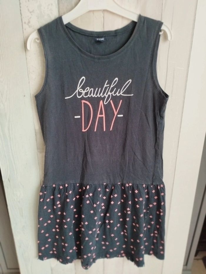 Robe estivales sans manches, écriture sur le devant et motifs en bas. Pourtour du bas de la robe stylisé / découpé. De chez Kiabi, en taille 12 ans. => il y a un reflet sur la photo mais elle n'est pas décolorée en vrai. #rosered16fille #12arosered16 #rosered16fille #12arosered16
