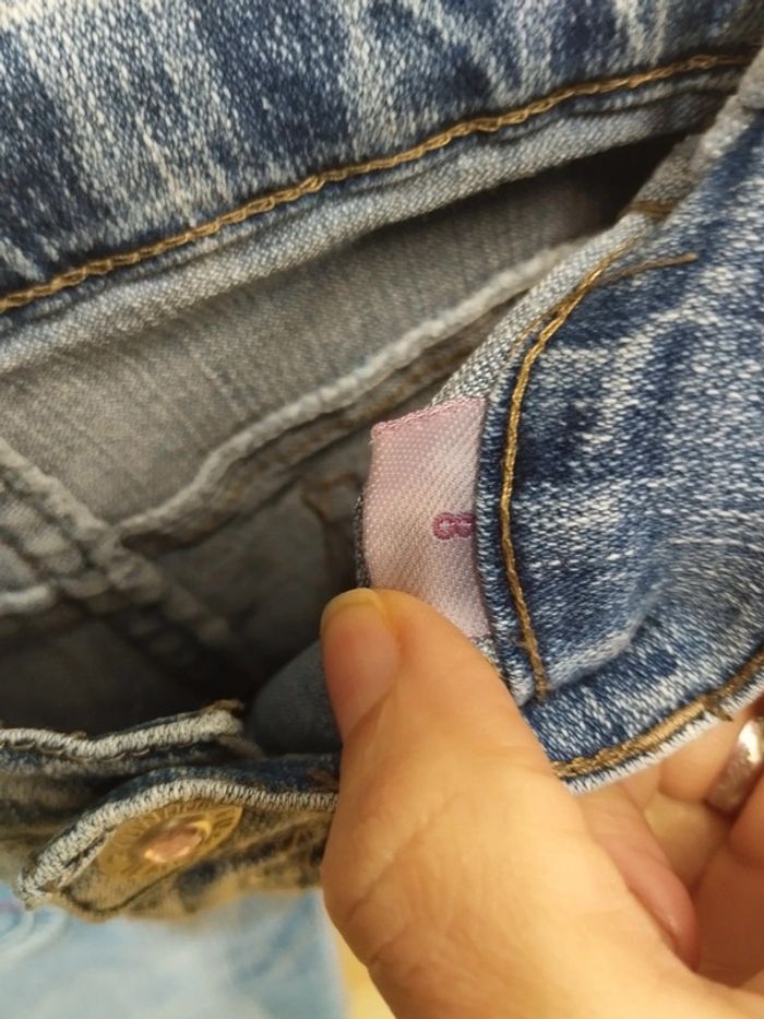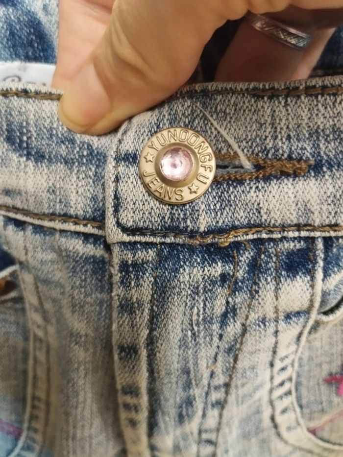 Jeans pantacourt avec le bas évasé et des fleurs sur les poches. réglable à la taille. En 8 ans, de marque Yundongfu. #rosered16fille #8arosered16
